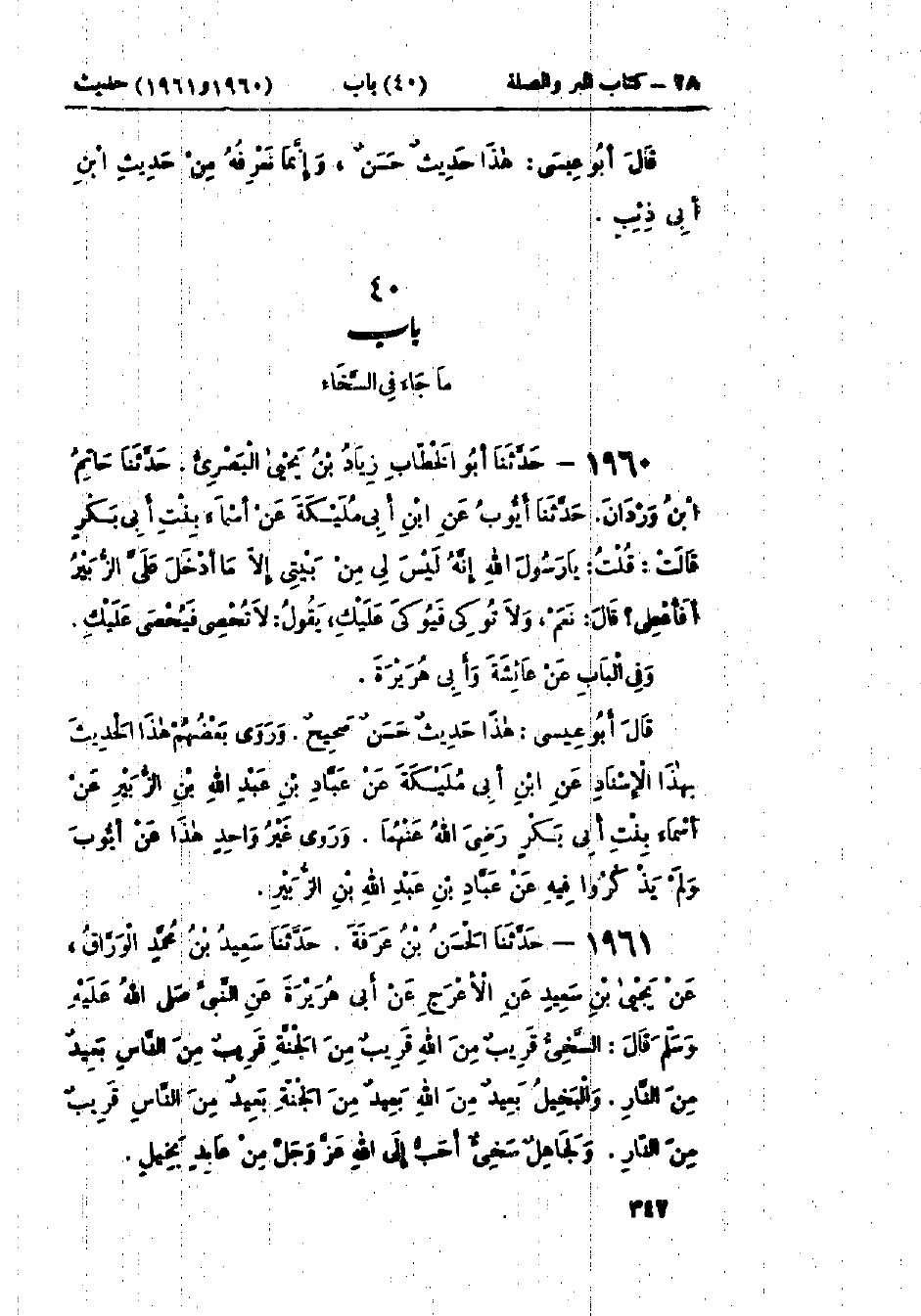 1960 - حَدَّثَنَا أَبُو الخَطَّابِ زِيَادُ بْنُ يَحْيَى البَصْرِيُّ قَالَ: حَدَّثَنَا حَاتِمُ بْنُ وَرْدَانَ قَالَ: حَدَّثَنَا أَيُّوبُ، عَنْ ابْنِ أَبِي مُلَيْكَةَ، عَنْ أَسْمَاءَ بِنْتِ أَبِي بَكْرٍ قَالَتْ: قُلْتُ: يَا رَسُولَ اللَّهِ، إِنَّهُ لَيْسَ لِي مِنْ شَيْءٍ إِلَّا مَا أَدْخَلَ عَلَيَّ الزُّبَيْرُ أَفَأُعْطِي؟ قَالَ: «§نَعَمْ، وَلَا تُوكِي فَيُوكَى عَلَيْكِ» يَقُولُ: «لَا تُحْصِي فَيُحْصَى عَلَيْكِ» وَفِي البَابِ عَنْ عَائِشَةَ، وَأَبِي هُرَيْرَةَ: هَذَا حَدِيثٌ حَسَنٌ صَحِيحٌ وَرَوَى بَعْضُهُمْ هَذَا الحَدِيثَ بِهَذَا الإِسْنَادِ عَنْ ابْنِ أَبِي مُلَيْكَةَ، عَنْ عَبَّادِ بْنِ عَبْدِ اللَّهِ بْنِ الزُّبَيْرِ، عَنْ أَسْمَاءَ بِنْتِ أَبِي بَكْرٍ، وَرَوَى غَيْرُ وَاحِدٍ هَذَا، عَنْ أَيُّوبَ، وَلَمْ يَذْكُرُوا فِيهِ عَنْ عَبَّادِ بْنِ عَبْدِ اللَّهِ بْنِ الزُّبَيْرِ