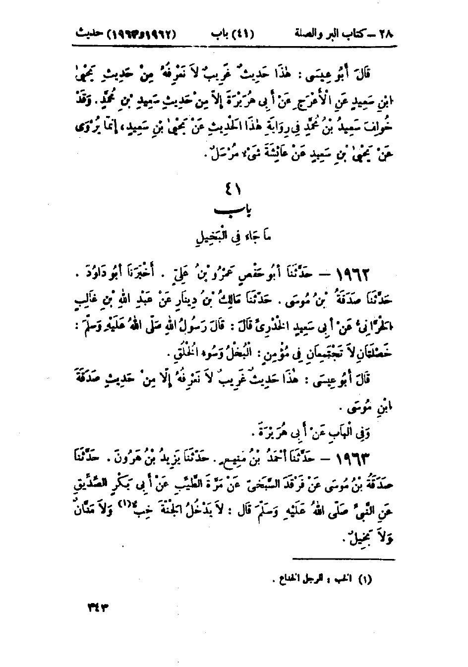 1963 - حَدَّثَنَا أَحْمَدُ بْنُ مَنِيعٍ قَالَ: حَدَّثَنَا يَزِيدُ بْنُ هَارُونَ قَالَ: حَدَّثَنَا صَدَقَةُ بْنُ مُوسَى، عَنْ فَرْقَدٍ السَّبَخِيِّ، عَنْ مُرَّةَ الطَّيِّبِ، عَنْ أَبِي بَكْرٍ الصِّدِّيقِ، عَنِ النَّبِيِّ صَلَّى اللَّهُ عَلَيْهِ وَسَلَّمَ قَالَ: «§لَا يَدْخُلُ الجَنَّةَ خِبٌّ وَلَا مَنَّانٌ وَلَا بَخِيلٌ»: -[344]- هَذَا حَدِيثٌ حَسَنٌ غَرِيبٌ