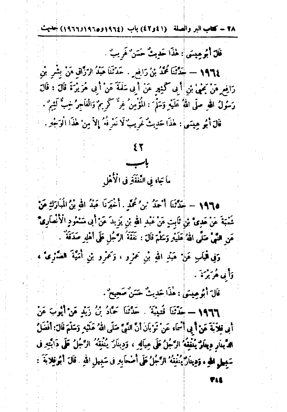 1965 - حَدَّثَنَا أَحْمَدُ بْنُ مُحَمَّدٍ قَالَ: أَخْبَرَنَا عَبْدُ اللَّهِ بْنُ المُبَارَكِ، عَنْ شُعْبَةَ، عَنْ عَدِيِّ بْنِ ثَابِتٍ، عَنْ عَبْدِ اللَّهِ بْنِ يَزِيدَ، عَنْ أَبِي مَسْعُودٍ الأَنْصَارِيِّ، عَنِ النَّبِيِّ صَلَّى اللَّهُ عَلَيْهِ وَسَلَّمَ قَالَ: «§نَفَقَةُ الرَّجُلِ عَلَى أَهْلِهِ صَدَقَةٌ» وَفِي البَابِ عَنْ عَبْدِ اللَّهِ بْنِ عَمْرٍو، وَعَمْرِو بْنِ أُمَيَّةَ الضَّمْرِيِّ، وَأَبِي هُرَيْرَةَ: هَذَا حَدِيثٌ حَسَنٌ صَحِيحٌ