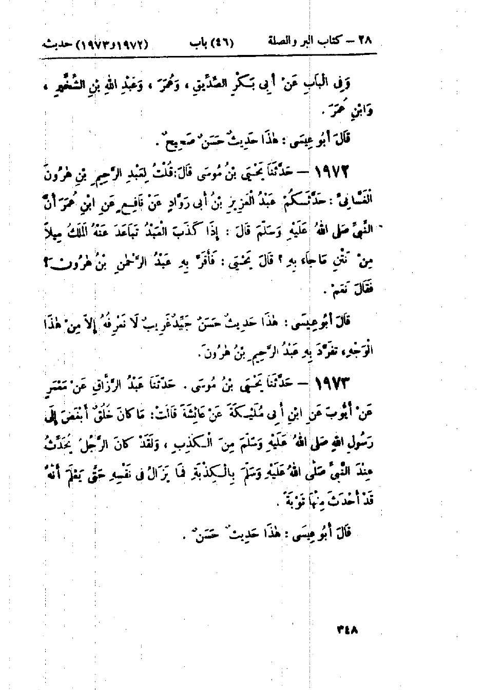 1972 - حَدَّثَنَا يَحْيَى بْنُ مُوسَى، قَالَ: قُلْتُ لِعَبْدِ الرَّحِيمِ بْنِ هَارُونَ الغَسَّانِيِّ، حَدَّثَكُمْ عَبْدُ العَزِيزِ بْنُ أَبِي رَوَّادٍ، عَنْ نَافِعٍ، عَنْ ابْنِ عُمَرَ، أَنَّ النَّبِيَّ صَلَّى اللَّهُ عَلَيْهِ وَسَلَّمَ قَالَ: «§إِذَا كَذَبَ العَبْدُ تَبَاعَدَ عَنْهُ المَلَكُ مِيلًا مِنْ نَتْنِ مَا جَاءَ بِهِ؟» قَالَ يَحْيَى: فَأَقَرَّ بِهِ عَبْدُ الرَّحِيمِ بْنُ هَارُونَ، فَقَالَ: نَعَمْ،: هَذَا حَدِيثٌ حَسَنٌ غَرِيبٌ لَا نَعْرِفُهُ إِلَّا مِنْ هَذَا الوَجْهِ تَفَرَّدَ بِهِ عَبْدُ الرَّحِيمِ بْنُ هَارُونَ