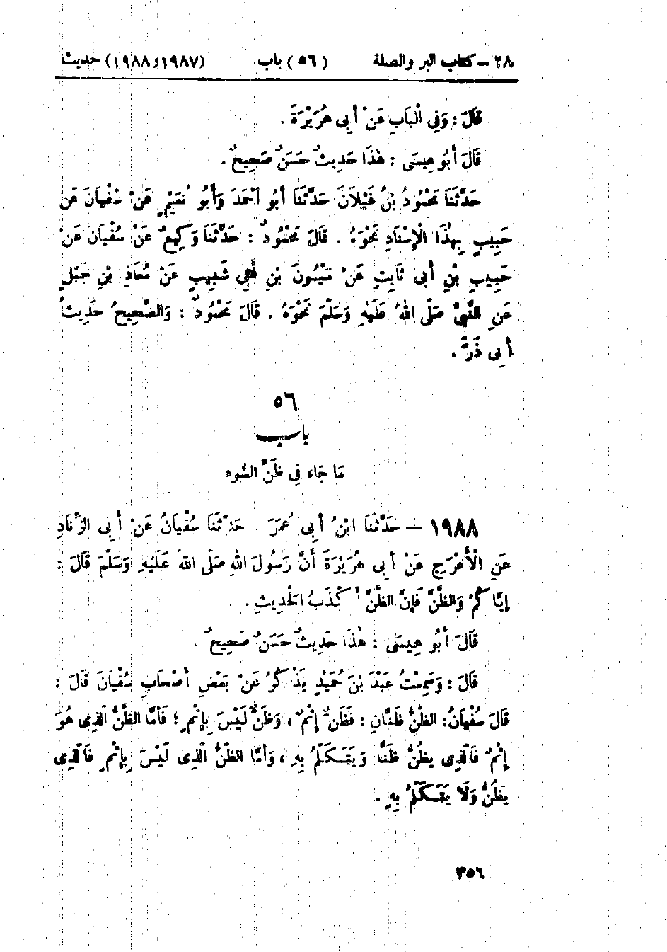 1988 - حَدَّثَنَا ابْنُ أَبِي عُمَرَ قَالَ: حَدَّثَنَا سُفْيَانُ، عَنْ أَبِي الزِّنَادِ، عَنْ الأَعْرَجِ، عَنْ أَبِي هُرَيْرَةَ، أَنَّ رَسُولَ اللَّهِ صَلَّى اللَّهُ عَلَيْهِ وَسَلَّمَ قَالَ: «§إِيَّاكُمْ وَالظَّنَّ فَإِنَّ الظَّنَّ أَكْذَبُ الحَدِيثِ»: هَذَا حَدِيثٌ حَسَنٌ صَحِيحٌ وَسَمِعْتُ عَبْدَ بْنَ حُمَيْدٍ يَذْكُرُ عَنْ بَعْضِ أَصْحَابِ سُفْيَانَ، قَالَ: قَالَ سُفْيَانُ: الظَّنُّ ظَنَّانِ: فَظَنٌّ إِثْمٌ، وَظَنٌّ لَيْسَ بِإِثْمٍ، فَأَمَّا الظَّنُّ الَّذِي هُوَ إِثْمٌ فَالَّذِي يَظُنُّ ظَنًّا وَيَتَكَلَّمُ بِهِ، وَأَمَّا الظَّنُّ الَّذِي لَيْسَ بِإِثْمٍ فَالَّذِي يَظُنُّ وَلَا يَتَكَلَّمُ بِهِ
