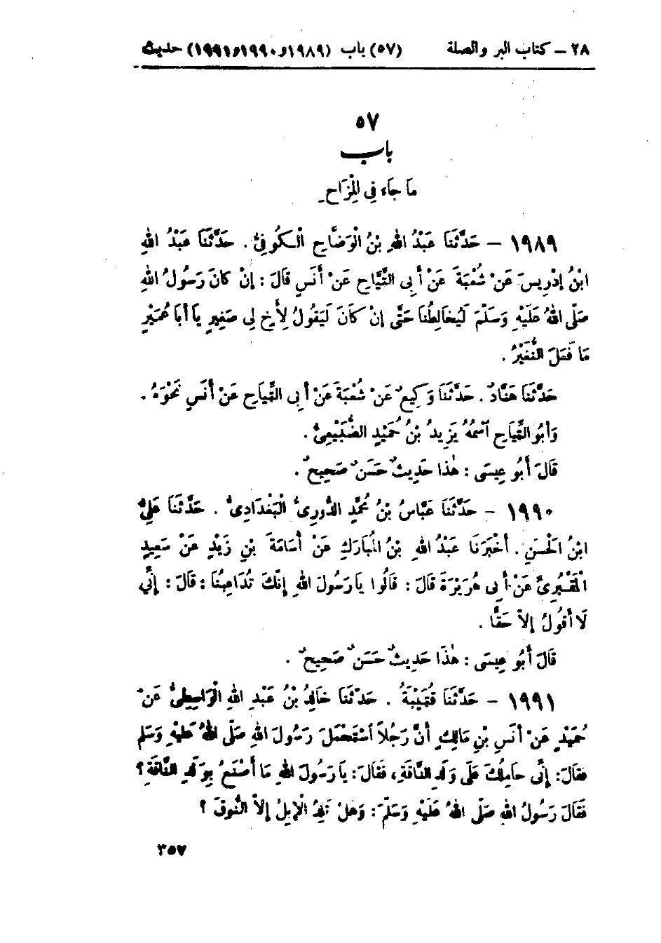 1990 - حَدَّثَنَا عَبَّاسُ بْنُ مُحَمَّدٍ الدُّورِيُّ البَغْدَادِيُّ قَالَ: حَدَّثَنَا عَلِيُّ بْنُ الحَسَنِ قَالَ: أَخْبَرَنَا عَبْدُ اللَّهِ بْنُ المُبَارَكِ، عَنْ أُسَامَةَ بْنِ زَيْدٍ، عَنْ سَعِيدٍ المَقْبُرِيِّ، عَنْ أَبِي هُرَيْرَةَ قَالَ: قَالُوا: يَا رَسُولَ اللَّهِ، إِنَّكَ تُدَاعِبُنَا، قَالَ: «§إِنِّي لَا أَقُولُ إِلَّا حَقًّا»: هَذَا حَدِيثٌ حَسَنٌ