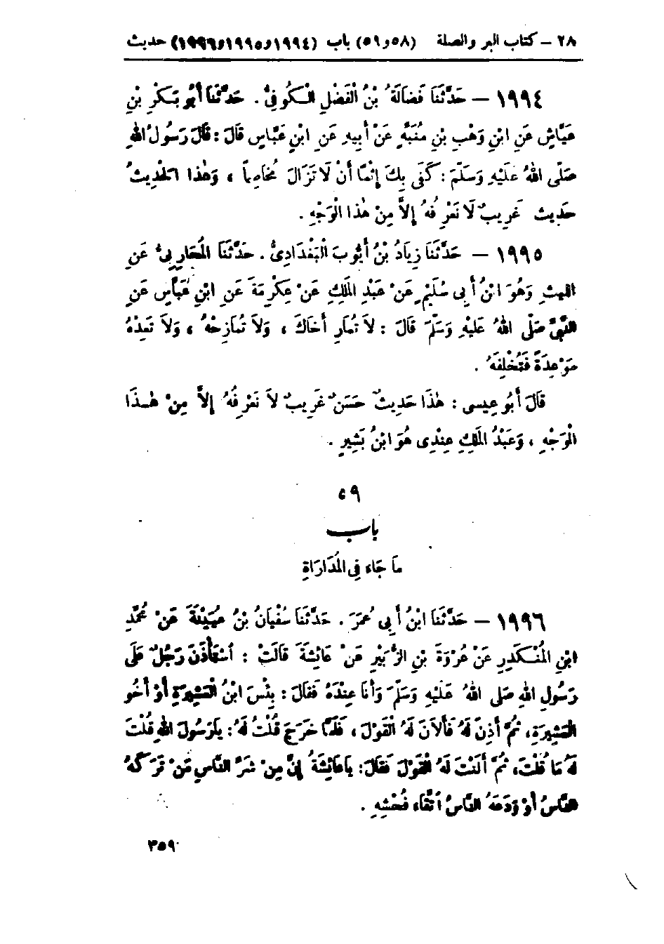 1995 - حَدَّثَنَا زِيَادُ بْنُ أَيُّوبَ البَغْدَادِيُّ قَالَ: حَدَّثَنَا المُحَارِبِيُّ، عَنْ اللَّيْثِ وَهُوَ ابْنُ أَبِي سُلَيْمٍ، عَنْ عَبْدِ المَلِكِ، عَنْ عِكْرِمَةَ، عَنْ ابْنِ عَبَّاسٍ، عَنِ النَّبِيِّ صَلَّى اللَّهُ عَلَيْهِ وَسَلَّمَ قَالَ: «§لَا تُمَارِ أَخَاكَ، وَلَا تُمَازِحْهُ، وَلَا تَعِدْهُ مَوْعِدًا فَتُخْلِفَهُ»: هَذَا حَدِيثٌ غَرِيبٌ لَا نَعْرِفُهُ إِلَّا مِنْ هَذَا الوَجْهِ وَعَبْدُ المَلِكِ عِنْدِي هُوَ ابْنُ أَبِي بَشِيرٍ