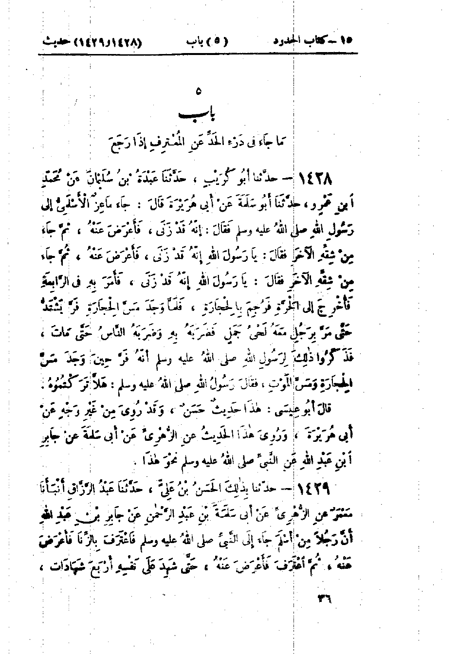 1429 - حَدَّثَنَا بِذَلِكَ الحَسَنُ بْنُ عَلِيٍّ قَالَ: حَدَّثَنَا عَبْدُ الرَّزَّاقِ قَالَ: أَخْبَرَنَا مَعْمَرٌ، عَنْ الزُّهْرِيِّ، عَنْ أَبِي سَلَمَةَ بْنِ عَبْدِ الرَّحْمَنِ، عَنْ جَابِرِ بْنِ عَبْدِ اللَّهِ، أَنَّ رَجُلًا مِنْ أَسْلَمَ جَاءَ إِلَى النَّبِيِّ صَلَّى اللَّهُ عَلَيْهِ وَسَلَّمَ فَاعْتَرَفَ بِالزِّنَا فَأَعْرَضَ عَنْهُ، ثُمَّ اعْتَرَفَ، فَأَعْرَضَ عَنْهُ، حَتَّى شَهِدَ عَلَى نَفْسِهِ أَرْبَعَ شَهَادَاتٍ، -[37]- فَقَالَ النَّبِيُّ صَلَّى اللَّهُ عَلَيْهِ وَسَلَّمَ: «§أَبِكَ جُنُونٌ»، قَالَ: لَا، قَالَ: «أَحْصَنْتَ؟»، قَالَ: نَعَمْ، قَالَ: فَأَمَرَ بِهِ، فَرُجِمَ بِالمُصَلَّى، فَلَمَّا أَذْلَقَتْهُ الحِجَارَةُ فَرَّ، فَأُدْرِكَ، فَرُجِمَ حَتَّى مَاتَ، فَقَالَ لَهُ رَسُولُ اللَّهِ صَلَّى اللَّهُ عَلَيْهِ وَسَلَّمَ خَيْرًا، وَلَمْ يُصَلِّ عَلَيْهِ: هَذَا حَدِيثٌ صَحِيحٌ وَالعَمَلُ عَلَى هَذَا الحَدِيثِ عِنْدَ بَعْضِ أَهْلِ العِلْمِ: أَنَّ المُعْتَرِفَ بِالزِّنَا إِذَا أَقَرَّ عَلَى نَفْسِهِ أَرْبَعَ مَرَّاتٍ أُقِيمَ عَلَيْهِ الحَدُّ، وَهُوَ قَوْلُ أَحْمَدَ، وَإِسْحَاقَ وقَالَ بَعْضُ أَهْلِ العِلْمِ: إِذَا أَقَرَّ عَلَى نَفْسِهِ مَرَّةً أُقِيمَ عَلَيْهِ الحَدُّ، وَهُوَ قَوْلُ مَالِكِ بْنِ أَنَسٍ، وَالشَّافِعِيِّ، وَحُجَّةُ مَنْ قَالَ هَذَا القَوْلَ حَدِيثُ أَبِي هُرَيْرَةَ، وَزَيْدِ بْنِ خَالِدٍ، أَنَّ رَجُلَيْنِ اخْتَصَمَا إِلَى رَسُولِ اللَّهِ صَلَّى اللَّهُ عَلَيْهِ وَسَلَّمَ، فَقَالَ أَحَدُهُمَا: يَا رَسُولَ اللَّهِ، إِنَّ ابْنِي زَنَى بِامْرَأَةِ هَذَا، الحَدِيثُ بِطُولِهِ، وَقَالَ النَّبِيُّ صَلَّى اللَّهُ عَلَيْهِ وَسَلَّمَ: «اغْدُ يَا أُنَيْسُ عَلَى امْرَأَةِ هَذَا فَإِنْ اعْتَرَفَتْ فَارْجُمْهَا»، وَلَمْ يَقُلْ فَإِنْ اعْتَرَفَتْ أَرْبَعَ مَرَّاتٍ