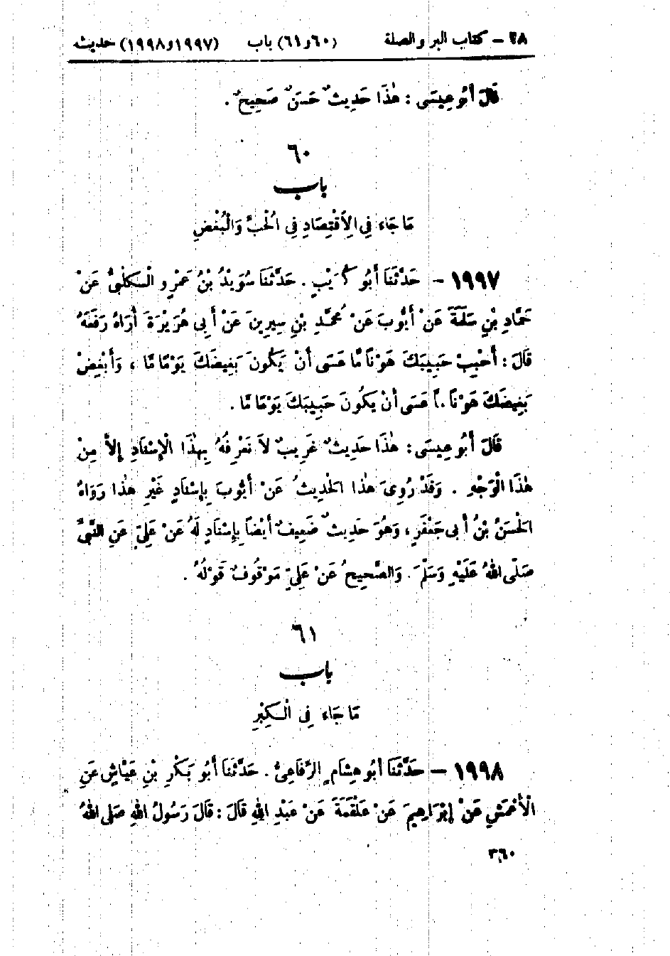 1997 - حَدَّثَنَا أَبُو كُرَيْبٍ قَالَ: حَدَّثَنَا سُوَيْدُ بْنُ عَمْرٍو الكَلْبِيُّ، عَنْ حَمَّادِ بْنِ سَلَمَةَ، عَنْ أَيُّوبَ، عَنْ مُحَمَّدِ بْنِ سِيرِينَ، عَنْ أَبِي هُرَيْرَةَ ـ أُرَاهُ رَفَعَهُ ـ قَالَ: «§أَحْبِبْ حَبِيبَكَ هَوْنًا مَا عَسَى أَنْ يَكُونَ بَغِيضَكَ يَوْمًا مَا، وَأَبْغِضْ بَغِيضَكَ هَوْنًا مَا عَسَى أَنْ يَكُونَ حَبِيبَكَ يَوْمًا مَا»: هَذَا حَدِيثٌ غَرِيبٌ لَا نَعْرِفُهُ بِهَذَا الإِسْنَادِ إِلَّا مِنْ هَذَا الوَجْهِ، وَقَدْ رُوِيَ هَذَا الحَدِيثُ عَنْ أَيُّوبَ، بِإِسْنَادٍ غَيْرِ هَذَا رَوَاهُ الحَسَنُ بْنُ أَبِي جَعْفَرٍ وَهُوَ حَدِيثٌ ضَعِيفٌ أَيْضًا، بِإِسْنَادٍ لَهُ عَنْ عَلِيٍّ، عَنِ النَّبِيِّ صَلَّى اللَّهُ عَلَيْهِ وَسَلَّمَ وَالصَّحِيحُ عَنْ عَلِيٍّ مَوْقُوفٌ قَوْلُهُ