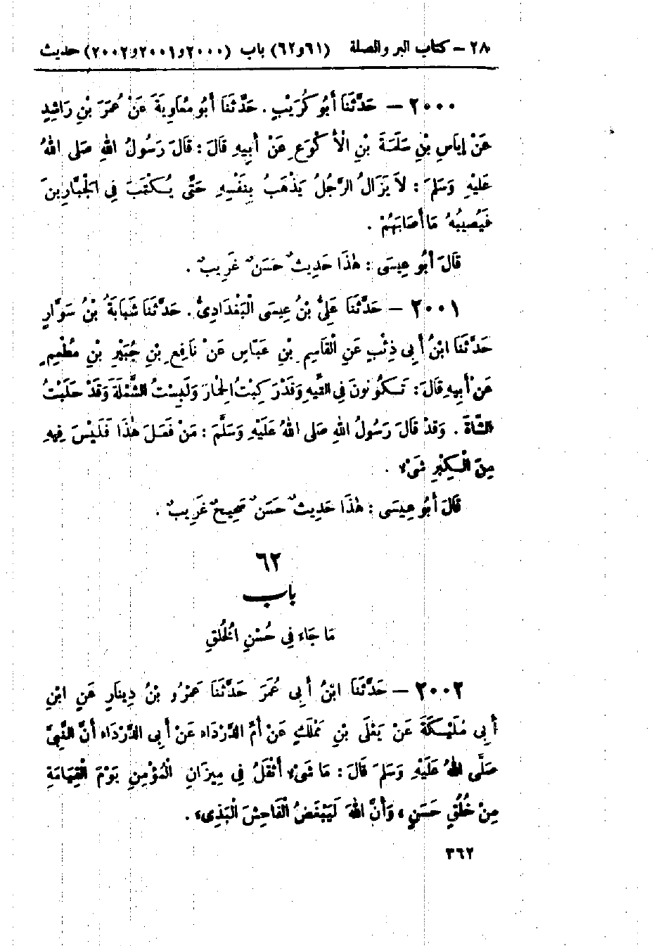 2002 - حَدَّثَنَا ابْنُ أَبِي عُمَرَ قَالَ: حَدَّثَنَا سُفْيَانُ قَالَ: حَدَّثَنَا عَمْرُو بْنُ دِينَارٍ، عَنْ ابْنِ أَبِي مُلَيْكَةَ، عَنْ يَعْلَى بْنِ مَمْلَكٍ، عَنْ أُمِّ الدَّرْدَاءِ، عَنْ أَبِي الدَّرْدَاءِ، أَنَّ النَّبِيَّ صَلَّى اللَّهُ عَلَيْهِ وَسَلَّمَ قَالَ: «§مَا شَيْءٌ أَثْقَلُ فِي مِيزَانِ المُؤْمِنِ يَوْمَ القِيَامَةِ مِنْ خُلُقٍ حَسَنٍ، وَإِنَّ اللَّهَ لَيُبْغِضُ الفَاحِشَ البَذِيءَ»: -[363]- وَفِي البَابِ عَنْ عَائِشَةَ، وَأَبِي هُرَيْرَةَ، وَأَنَسٍ، وَأُسَامَةَ بْنِ شَرِيكٍ وَهَذَا حَدِيثٌ حَسَنٌ صَحِيحٌ