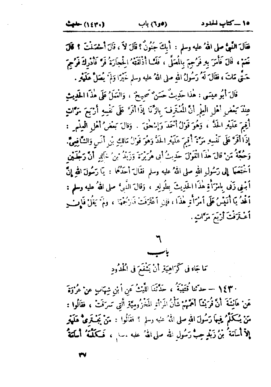 1430 - حَدَّثَنَا قُتَيْبَةُ قَالَ: حَدَّثَنَا اللَّيْثُ، عَنْ ابْنِ شِهَابٍ، عَنْ عُرْوَةَ، عَنْ عَائِشَةَ، أَنَّ قُرَيْشًا أَهَمَّهُمْ شَأْنُ المَرْأَةِ المَخْزُومِيَّةِ الَّتِي سَرَقَتْ، فَقَالُوا: مَنْ يُكَلِّمُ فِيهَا رَسُولَ اللَّهِ صَلَّى اللَّهُ عَلَيْهِ وَسَلَّمَ؟ فَقَالُوا: مَنْ يَجْتَرِئُ عَلَيْهِ إِلَّا أُسَامَةُ بْنُ زَيْدٍ حِبُّ رَسُولِ اللَّهِ صَلَّى اللَّهُ عَلَيْهِ وَسَلَّمَ، فَكَلَّمَهُ أُسَامَةُ، -[38]- فَقَالَ رَسُولُ اللَّهِ صَلَّى اللَّهُ عَلَيْهِ وَسَلَّمَ: «أَتَشْفَعُ فِي حَدٍّ مِنْ حُدُودِ اللَّهِ؟»، ثُمَّ قَامَ فَاخْتَطَبَ، فَقَالَ: «§إِنَّمَا أَهْلَكَ الَّذِينَ مِنْ قَبْلِكُمْ أَنَّهُمْ كَانُوا إِذَا سَرَقَ فِيهِمُ الشَّرِيفُ تَرَكُوهُ، وَإِذَا سَرَقَ فِيهِمُ الضَّعِيفُ أَقَامُوا عَلَيْهِ الحَدَّ، وَايْمُ اللَّهِ لَوْ أَنَّ فَاطِمَةَ بِنْتَ مُحَمَّدٍ سَرَقَتْ لَقَطَعْتُ يَدَهَا» وَفِي البَابِ عَنْ مَسْعُودِ ابْنِ العَجْمَاءِ وَيُقَالُ: ابْنُ الْأَعْجَمِ، وَابْنِ عُمَرَ، وَجَابِرٍ: حَدِيثُ عَائِشَةَ حَدِيثٌ حَسَنٌ صَحِيحٌ