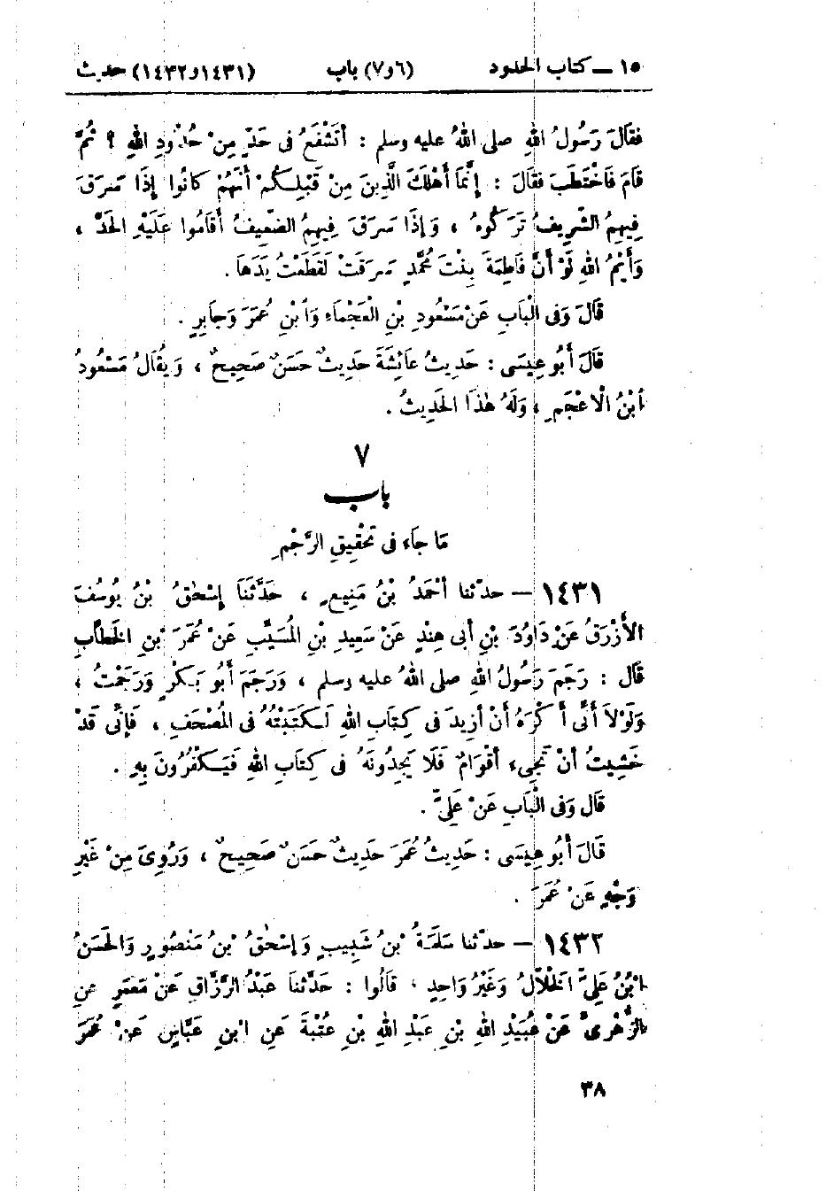 1431 - حَدَّثَنَا أَحْمَدُ بْنُ مَنِيعٍ قَالَ: حَدَّثَنَا إِسْحَاقُ بْنُ يُوسُفَ الأَزْرَقُ، عَنْ دَاوُدَ بْنِ أَبِي هِنْدٍ، عَنْ سَعِيدِ بْنِ المُسَيِّبِ، عَنْ عُمَرَ بْنِ الخَطَّابِ قَالَ: «§رَجَمَ رَسُولُ اللَّهِ صَلَّى اللَّهُ عَلَيْهِ وَسَلَّمَ، وَرَجَمَ أَبُو بَكْرٍ، وَرَجَمْتُ»، وَلَوْلَا أَنِّي أَكْرَهُ أَنْ أَزِيدَ فِي كِتَابِ اللَّهِ لَكَتَبْتُهُ فِي المُصْحَفِ، فَإِنِّي قَدْ خَشِيتُ أَنْ تَجِيءَ أَقْوَامٌ فَلَا يَجِدُونَهُ فِي كِتَابِ اللَّهِ فَيَكْفُرُونَ بِهِ وَفِي البَابِ عَنْ عَلِيٍّ: حَدِيثُ عُمَرَ حَدِيثٌ حَسَنٌ صَحِيحٌ، وَرُوِيَ مِنْ غَيْرِ وَجْهٍ عَنْ عُمَرَ