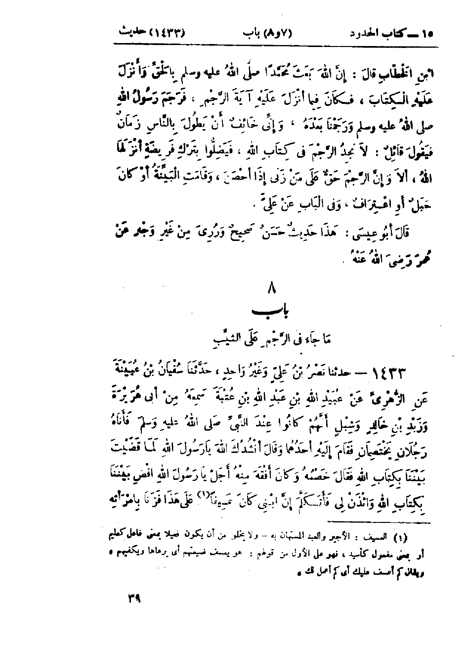 1433 - حَدَّثَنَا نَصْرُ بْنُ عَلِيٍّ، وَغَيْرُ وَاحِدٍ، قَالُوا: حَدَّثَنَا سُفْيَانُ بْنُ عُيَيْنَةَ، عَنْ الزُّهْرِيِّ، عَنْ عُبَيْدِ اللَّهِ بْنِ عَبْدِ اللَّهِ بْنِ عُتْبَةَ، سَمِعَهُ مِنْ أَبِي هُرَيْرَةَ، وَزَيْدِ بْنِ خَالِدٍ، وَشِبْلٍ، أَنَّهُمْ كَانُوا عِنْدَ النَّبِيِّ صَلَّى اللَّهُ عَلَيْهِ وَسَلَّمَ فَأَتَاهُ رَجُلَانِ يَخْتَصِمَانِ، فَقَامَ إِلَيْهِ أَحَدُهُمَا، وَقَالَ: أَنْشُدُكَ اللَّهَ يَا رَسُولَ اللَّهِ، لَمَا قَضَيْتَ بَيْنَنَا بِكِتَابِ اللَّهِ؟ فَقَالَ خَصْمُهُ وَكَانَ أَفْقَهَ مِنْهُ: أَجَلْ يَا رَسُولَ اللَّهِ، اقْضِ بَيْنَنَا بِكِتَابِ اللَّهِ، وَائْذَنْ لِي فَأَتَكَلَّمَ: إِنَّ ابْنِي كَانَ عَسِيفًا عَلَى هَذَا، فَزَنَى بِامْرَأَتِهِ، -[40]- فَأَخْبَرُونِي أَنَّ عَلَى ابْنِي الرَّجْمَ، فَفَدَيْتُ مِنْهُ بِمِائَةِ شَاةٍ وَخَادِمٍ، ثُمَّ لَقِيتُ نَاسًا مِنْ أَهْلِ العِلْمِ، فَزَعَمُوا أَنَّ عَلَى ابْنِي جَلْدَ مِائَةٍ، وَتَغْرِيبَ عَامٍ، وَإِنَّمَا الرَّجْمُ عَلَى امْرَأَةِ هَذَا، فَقَالَ النَّبِيُّ صَلَّى اللَّهُ عَلَيْهِ وَسَلَّمَ: «وَالَّذِي نَفْسِي بِيَدِهِ، §لَأَقْضِيَنَّ بَيْنَكُمَا بِكِتَابِ اللَّهِ، المِائَةُ شَاةٍ وَالخَادِمُ رَدٌّ عَلَيْكَ، وَعَلَى ابْنِكَ جَلْدُ مِائَةٍ، وَتَغْرِيبُ عَامٍ، وَاغْدُ يَا أُنَيْسُ عَلَى امْرَأَةِ هَذَا، فَإِنْ اعْتَرَفَتْ فَارْجُمْهَا»، فَغَدَا عَلَيْهَا، فَاعْتَرَفَتْ فَرَجَمَهَا حَدَّثَنَا إِسْحَاقُ بْنُ مُوسَى الأَنْصَارِيُّ قَالَ: حَدَّثَنَا مَعْنٌ قَالَ: حَدَّثَنَا مَالِكٌ، عَنْ ابْنِ شِهَابٍ، عَنْ عُبَيْدِ اللَّهِ بْنِ عَبْدِ اللَّهِ، عَنْ أَبِي هُرَيْرَةَ، وَزَيْدِ بْنِ خَالِدٍ الجُهَنِيِّ، عَنِ النَّبِيِّ صَلَّى اللَّهُ عَلَيْهِ وَسَلَّمَ نَحْوَهُ بِمَعْنَاهُ، حَدَّثَنَا قُتَيْبَةُ قَالَ: حَدَّثَنَا اللَّيْثُ، عَنْ ابْنِ شِهَابٍ بِإِسْنَادِهِ نَحْوَ حَدِيثِ مَالِكٍ بِمَعْنَاهُ، وَفِي البَابِ عَنْ أَبِي بَكْرَةَ، وَعُبَادَةَ بْنِ الصَّامِتِ، وَأَبِي هُرَيْرَةَ، وَأَبِي سَعِيدٍ، وَابْنِ عَبَّاسٍ، وَجَابِرِ بْنِ سَمُرَةَ، وَهَزَّالٍ، وَبُرَيْدَةَ، وَسَلَمَةَ بْنِ المُحَبَّقِ، وَأَبِي بَرْزَةَ، وَعِمْرَانَ بْنِ حُصَيْنٍ: حَدِيثُ أَبِي هُرَيْرَةَ، وَزَيْدِ بْنِ خَالِدٍ حَدِيثٌ حَسَنٌ صَحِيحٌ وَهَكَذَا رَوَى مَالِكُ بْنُ أَنَسٍ، وَمَعْمَرٌ، وَغَيْرُ وَاحِدٍ، عَنِ الزُّهْرِيِّ، عَنْ عُبَيْدِ اللَّهِ بْنِ عَبْدِ اللَّهِ بْنِ عُتْبَةَ، عَنْ أَبِي هُرَيْرَةَ، وَزَيْدِ بْنِ خَالِدٍ، عَنِ النَّبِيِّ صَلَّى اللَّهُ عَلَيْهِ وَسَلَّمَ
