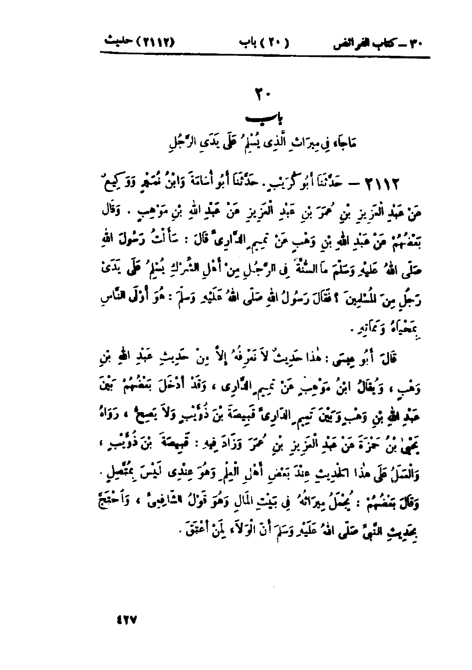2112 - حَدَّثَنَا أَبُو كُرَيْبٍ قَالَ: حَدَّثَنَا أَبُو أُسَامَةَ، وَابْنُ نُمَيْرٍ، وَوَكِيعٌ، عَنْ عَبْدِ العَزِيزِ بْنِ عُمَرَ بْنِ عَبْدِ العَزِيزِ، عَنْ عَبْدِ اللَّهِ بْنِ مَوْهَبٍ، وَقَالَ بَعْضُهُمْ: عَنْ عَبْدِ اللَّهِ بْنِ وَهْبٍ، عَنْ تَمِيمٍ الدَّارِيِّ قَالَ: سَأَلْتُ رَسُولَ اللَّهِ صَلَّى اللَّهُ عَلَيْهِ وَسَلَّمَ مَا السُّنَّةُ فِي الرَّجُلِ مِنْ أَهْلِ الشِّرْكِ يُسْلِمُ عَلَى يَدَيْ رَجُلٍ مِنَ المُسْلِمِينَ؟ فَقَالَ رَسُولُ اللَّهِ صَلَّى اللَّهُ عَلَيْهِ وَسَلَّمَ: «§هُوَ أَوْلَى النَّاسِ بِمَحْيَاهُ وَمَمَاتِهِ»: هَذَا حَدِيثٌ لَا نَعْرِفُهُ إِلَّا مِنْ حَدِيثِ عَبْدِ اللَّهِ بْنِ وَهْبٍ وَيُقَالَ: ابْنُ مَوْهَبٍ عَنْ تَمِيمٍ الدَّارِيِّ وَقَدْ أَدْخَلَ بَعْضُهُمْ بَيْنَ عَبْدِ اللَّهِ بْنِ مَوْهَبٍ وَبَيْنَ تَمِيمٍ الدَّارِيِّ قَبِيصَةَ بْنَ ذُؤَيْبٍ. رَوَاهُ يَحْيَى بْنُ حَمْزَةَ، عَنْ عَبْدِ العَزِيزِ بْنِ عُمَرَ، وَزَادَ فِيهِ قَبِيصَةَ بْنَ ذُؤَيْبٍ، وَالعَمَلُ عَلَى هَذَا الحَدِيثِ عِنْدَ بَعْضِ أَهْلِ العِلْمِ وَهُوَ عِنْدِي لَيْسَ بِمُتَّصِلٍ وَقَالَ: بَعْضُهُمْ يُجْعَلُ مِيرَاثُهُ فِي بَيْتِ المَالِ، وَهُوَ قَوْلُ الشَّافِعِيِّ، وَاحْتَجَّ بِحَدِيثِ النَّبِيِّ صَلَّى اللَّهُ عَلَيْهِ وَسَلَّمَ: «أَنَّ الوَلَاءَ لِمَنْ أَعْتَقَ»
