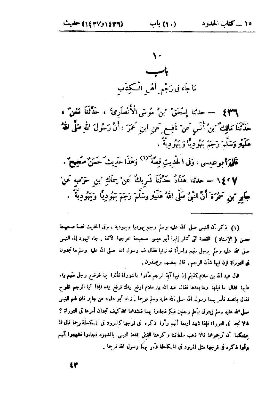 1436 - حَدَّثَنَا إِسْحَاقُ بْنُ مُوسَى الأَنْصَارِيُّ قَالَ: حَدَّثَنَا مَعْنٌ قَالَ: حَدَّثَنَا مَالِكُ بْنُ أَنَسٍ، عَنْ نَافِعٍ، عَنْ ابْنِ عُمَرَ، «أَنَّ رَسُولَ اللَّهِ صَلَّى اللَّهُ عَلَيْهِ وَسَلَّمَ §رَجَمَ يَهُودِيًّا وَيَهُودِيَّةً»: وَفِي الحَدِيثِ قِصَّةٌ، وَهَذَا حَدِيثٌ حَسَنٌ صَحِيحٌ