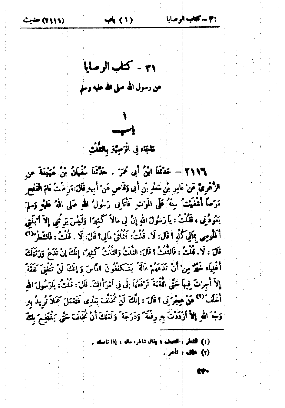 2116 - حَدَّثَنَا ابْنُ أَبِي عُمَرَ قَالَ: حَدَّثَنَا سُفْيَانُ بْنُ عُيَيْنَةَ، عَنْ الزُّهْرِيِّ، عَنْ عَامِرِ بْنِ سَعْدِ بْنِ أَبِي وَقَّاصٍ، عَنْ أَبِيهِ قَالَ: مَرِضْتُ عَامَ الفَتْحِ مَرَضًا أَشْفَيْتُ مِنْهُ عَلَى المَوْتِ، فَأَتَانِي رَسُولُ اللَّهِ صَلَّى اللَّهُ عَلَيْهِ وَسَلَّمَ يَعُودُنِي، فَقُلْتُ: يَا رَسُولَ اللَّهِ، إِنَّ لِي مَالًا كَثِيرًا، وَلَيْسَ يَرِثُنِي إِلَّا ابْنَتِي، أَفَأُوصِي بِمَالِي كُلِّهِ؟ قَالَ: «لَا»، قُلْتُ: فَثُلُثَيْ مَالِي؟ قَالَ: «لَا»، قُلْتُ: فَالشَّطْرُ؟ قَالَ: «لَا»، قُلْتُ: فَالثُّلُثُ؟ قَالَ: «الثُّلُثُ وَالثُّلُثُ كَثِيرٌ، إِنَّكَ §إِنْ تَذَرْ وَرَثَتَكَ أَغْنِيَاءَ خَيْرٌ مِنْ أَنْ تَذَرَهُمْ عَالَةً يَتَكَفَّفُونَ النَّاسَ، وَإِنَّكَ لَنْ تُنْفِقَ نَفَقَةً إِلَّا أُجِرْتَ فِيهَا حَتَّى اللُّقْمَةَ تَرْفَعُهَا إِلَى فِي امْرَأَتِكَ»، قَالَ: قُلْتُ: يَا رَسُولَ اللَّهِ، أُخَلَّفُ عَنْ هِجْرَتِي؟ قَالَ: «إِنَّكَ لَنْ تُخَلَّفَ بَعْدِي فَتَعْمَلَ عَمَلًا تُرِيدُ بِهِ وَجْهَ اللَّهِ إِلَّا ازْدَدْتَ بِهِ رِفْعَةً وَدَرَجَةً وَلَعَلَّكَ أَنْ تُخَلَّفَ حَتَّى يَنْتَفِعَ بِكَ -[431]- أَقْوَامٌ وَيُضَرَّ بِكَ آخَرُونَ، اللَّهُمَّ أَمْضِ لِأَصْحَابِي هِجْرَتَهُمْ وَلَا تَرُدَّهُمْ عَلَى أَعْقَابِهِمْ» لَكِنِ البَائِسُ سَعْدُ ابْنُ خَوْلَةَ يَرْثِي لَهُ رَسُولُ اللَّهِ صَلَّى اللَّهُ عَلَيْهِ وَسَلَّمَ أَنْ مَاتَ بِمَكَّةَ: وَفِي البَابِ عَنْ ابْنِ عَبَّاسٍ وَهَذَا حَدِيثٌ حَسَنٌ صَحِيحٌ وَقَدْ رُوِيَ هَذَا الحَدِيثُ مِنْ غَيْرِ وَجْهٍ عَنْ سَعْدِ بْنِ أَبِي وَقَّاصٍ وَالعَمَلُ عَلَى هَذَا عِنْدَ أَهْلِ العِلْمِ أَنَّهُ لَيْسَ لِلرَّجُلِ أَنْ يُوصِيَ بِأَكْثَرَ مِنَ الثُّلُثِ، وَقَدْ اسْتَحَبَّ بَعْضُ أَهْلِ العِلْمِ أَنْ يَنْقُصَ مِنَ الثُّلُثِ لِقَوْلِ رَسُولِ اللَّهِ صَلَّى اللَّهُ عَلَيْهِ وَسَلَّمَ: «وَالثُّلُثُ كَثِيرٌ»