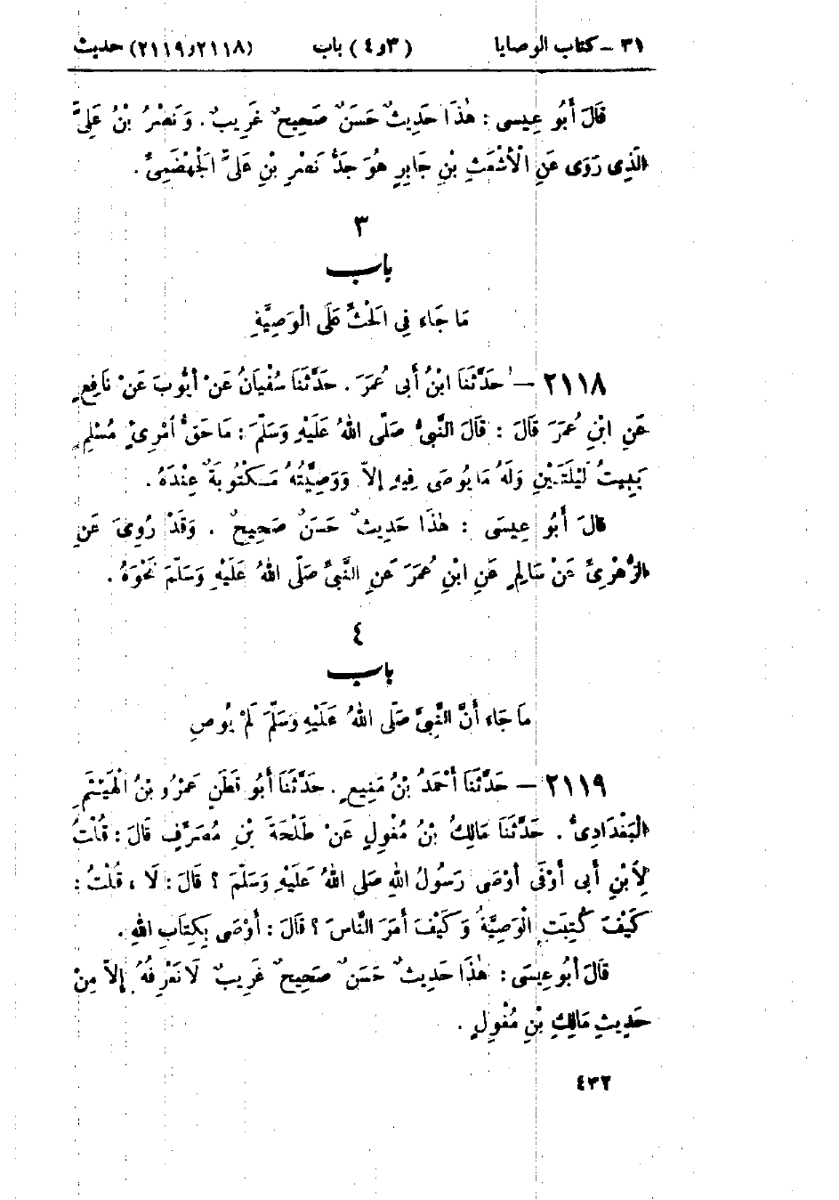 2119 - حَدَّثَنَا أَحْمَدُ بْنُ مَنِيعٍ قَالَ: حَدَّثَنَا أَبُو قَطَنٍ عَمْرُو بْنُ الهَيْثَمِ البَغْدَادِيُّ قَالَ: حَدَّثَنَا مَالِكُ بْنُ مِغْوَلٍ، عَنْ طَلْحَةَ بْنِ مُصَرِّفٍ قَالَ: قُلْتُ لِابْنِ أَبِي أَوْفَى: أَوْصَى رَسُولُ اللَّهِ صَلَّى اللَّهُ عَلَيْهِ وَسَلَّمَ؟ قَالَ: «لَا» قُلْتُ: كَيْفَ كُتِبَتِ الوَصِيَّةُ وَكَيْفَ أَمَرَ النَّاسَ؟ قَالَ: «§أَوْصَى بِكِتَابِ اللَّهِ»: هَذَا حَدِيثٌ حَسَنٌ صَحِيحٌ غَرِيبٌ لَا نَعْرِفُهُ إِلَّا مِنْ حَدِيثِ مَالِكِ بْنِ مِغْوَلٍ