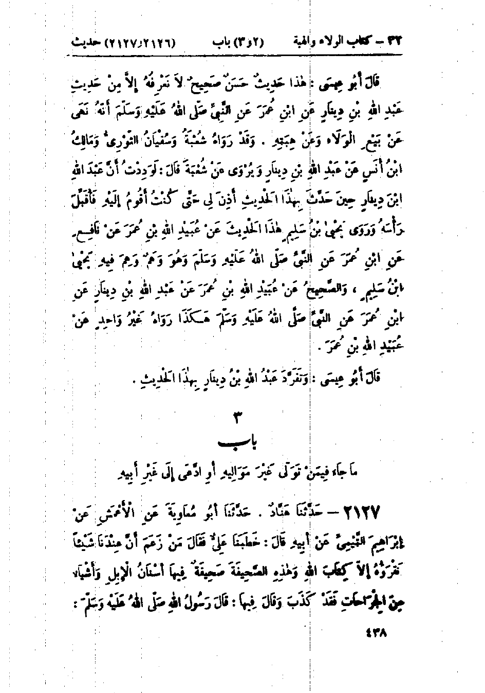 2127 - حَدَّثَنَا هَنَّادٌ قَالَ: حَدَّثَنَا أَبُو مُعَاوِيَةَ، عَنْ الأَعْمَشِ، عَنْ إِبْرَاهِيمَ التَّيْمِيِّ، عَنْ أَبِيهِ قَالَ: خَطَبَنَا عَلِيٌّ فَقَالَ: مَنْ زَعَمَ أَنَّ عِنْدَنَا شَيْئًا نَقْرَؤُهُ إِلَّا كِتَابَ اللَّهِ وَهَذِهِ الصَّحِيفَةَ - صَحِيفَةٌ فِيهَا أَسْنَانُ الإِبِلِ وَأَشْيَاءٌ مِنَ الجِرَاحَاتِ - فَقَدْ كَذَبَ، وَقَالَ فِيهَا: قَالَ رَسُولُ اللَّهِ صَلَّى اللَّهُ عَلَيْهِ وَسَلَّمَ: -[439]- «§المَدِينَةُ حَرَمٌ مَا بَيْنَ عَيْرٍ إِلَى ثَوْرٍ، فَمَنْ أَحْدَثَ فِيهَا حَدَثًا أَوْ آوَى مُحْدِثًا فَعَلَيْهِ لَعْنَةُ اللَّهِ وَالمَلَائِكَةِ وَالنَّاسِ أَجْمَعِينَ، لَا يَقْبَلُ اللَّهُ مِنْهُ يَوْمَ القِيَامَةِ صَرْفًا وَلَا عَدْلًا، وَمَنْ ادَّعَى إِلَى غَيْرِ أَبِيهِ أَوْ تَوَلَّى غَيْرَ مَوَالِيهِ فَعَلَيْهِ لَعْنَةُ اللَّهِ وَالمَلَائِكَةِ وَالنَّاسِ أَجْمَعِينَ، لَا يُقْبَلُ مِنْهُ صَرْفٌ وَلَا عَدْلٌ، وَذِمَّةُ المُسْلِمِينَ وَاحِدَةٌ يَسْعَى بِهَا أَدْنَاهُمْ». هَذَا حَدِيثٌ حَسَنٌ صَحِيحٌ. وَرَوَى بَعْضُهُمْ، عَنْ الأَعْمَشِ، عَنْ إِبْرَاهِيمَ التَّيْمِيِّ، عَنْ الحَارِثِ بْنِ سُوَيْدٍ، عَنْ عَلِيٍّ، نَحْوَهُ. وَقَدْ رُوِيَ مِنْ غَيْرِ وَجْهٍ عَنْ عَلِيٍّ عَنِ النَّبِيِّ صَلَّى اللَّهُ عَلَيْهِ وَسَلَّمَ