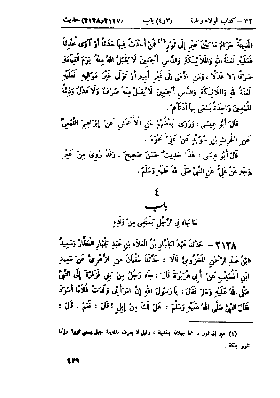 2128 - حَدَّثَنَا عَبْدُ الجَبَّارِ بْنُ العَلَاءِ الْعَطَّارُ، وَسَعِيدُ بْنُ عَبْدِ الرَّحْمَنِ المَخْزُومِيُّ، قَالَا: حَدَّثَنَا سُفْيَانُ، عَنْ الزُّهْرِيِّ، عَنْ سَعِيدِ بْنِ المُسَيِّبِ، عَنْ أَبِي هُرَيْرَةَ قَالَ: جَاءَ رَجُلٌ مِنْ بَنِي فَزَارَةَ إِلَى النَّبِيِّ صَلَّى اللَّهُ عَلَيْهِ وَسَلَّمَ فَقَالَ: يَا رَسُولَ اللَّهِ، إِنَّ امْرَأَتِي وَلَدَتْ غُلَامًا أَسْوَدَ، فَقَالَ النَّبِيُّ صَلَّى اللَّهُ عَلَيْهِ وَسَلَّمَ: «§هَلْ لَكَ مِنْ إِبِلٍ؟» قَالَ: نَعَمْ، قَالَ: -[440]- «فَمَا أَلْوَانُهَا؟» قَالَ: حُمْرٌ، قَالَ: «فَهَلْ فِيهَا أَوْرَقُ؟» قَالَ: نَعَمْ، إِنَّ فِيهَا لَوُرْقًا، قَالَ: «أَنَّى أَتَاهَا ذَلِكَ؟» قَالَ: لَعَلَّ عِرْقًا نَزَعَهَا، قَالَ: «فَهَذَا لَعَلَّ عِرْقًا نَزَعَهُ» هَذَا حَدِيثٌ حَسَنٌ صَحِيحٌ