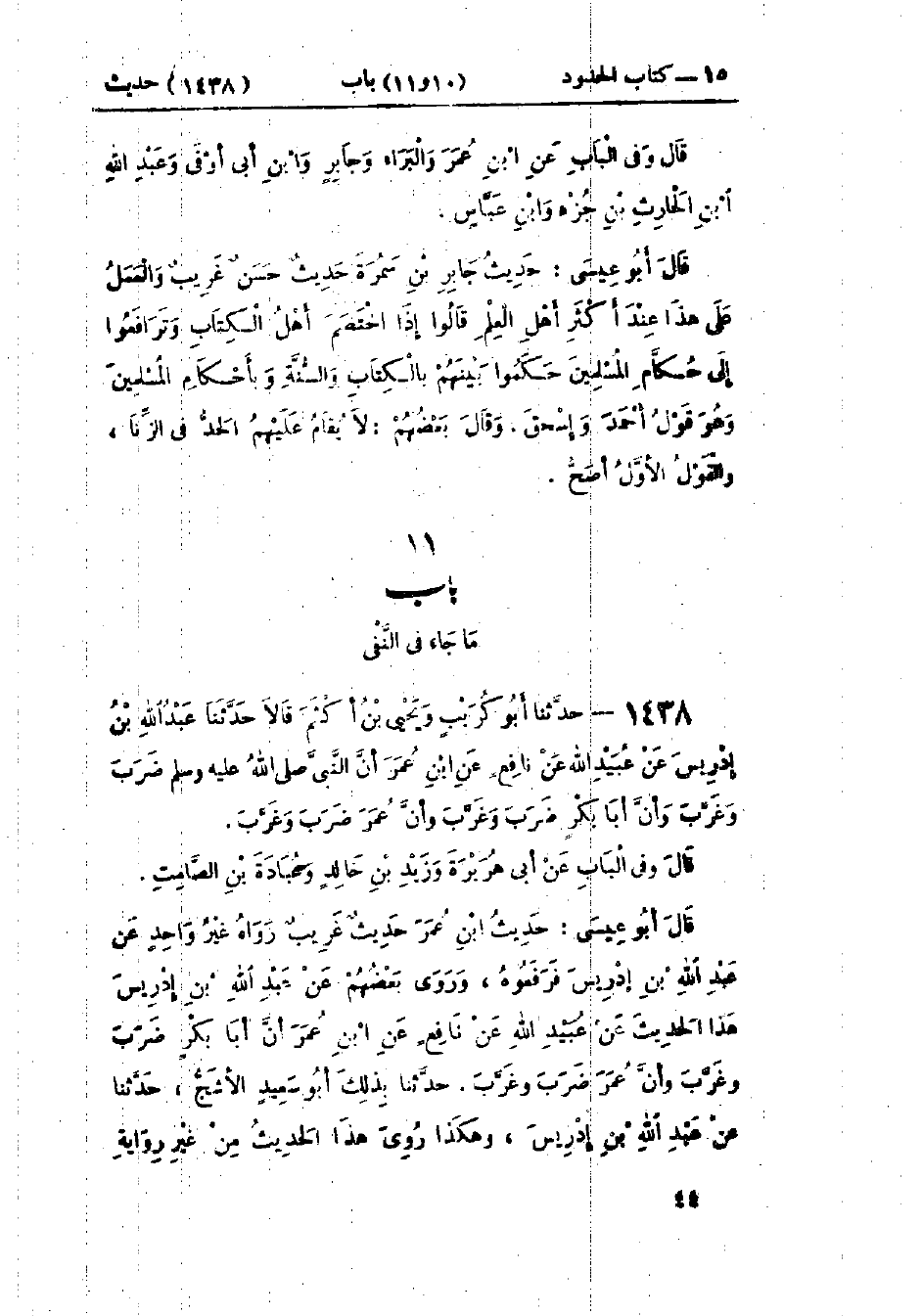 1438 - حَدَّثَنَا أَبُو كُرَيْبٍ، وَيَحْيَى بْنُ أَكْثَمَ، قَالَا: حَدَّثَنَا عَبْدُ اللَّهِ بْنُ إِدْرِيسَ، عَنْ عُبَيْدِ اللَّهِ، عَنْ نَافِعٍ، عَنْ ابْنِ عُمَرَ، «أَنَّ النَّبِيَّ صَلَّى اللَّهُ عَلَيْهِ وَسَلَّمَ §ضَرَبَ وَغَرَّبَ»، وَأَنَّ أَبَا بَكْرٍ ضَرَبَ وَغَرَّبَ، وَأَنَّ عُمَرَ ضَرَبَ وَغَرَّبَ وَفِي البَابِ عَنْ أَبِي هُرَيْرَةَ، وَزَيْدِ بْنِ خَالِدٍ، وَعُبَادَةَ بْنِ الصَّامِتِ: حَدِيثُ ابْنِ عُمَرَ حَدِيثٌ غَرِيبٌ، رَوَاهُ غَيْرُ وَاحِدٍ عَنْ عَبْدِ اللَّهِ بْنِ إِدْرِيسَ فَرَفَعُوهُ وَرَوَى بَعْضُهُمْ عَنْ عَبْدِ اللَّهِ بْنِ إِدْرِيسَ هَذَا الحَدِيثَ، عَنْ عُبَيْدِ اللَّهِ، عَنْ نَافِعٍ، عَنْ ابْنِ عُمَرَ «أَنَّ أَبَا بَكْرٍ ضَرَبَ وَغَرَّبَ، وَأَنَّ عُمَرَ ضَرَبَ وَغَرَّبَ»، حَدَّثَنَا بِذَلِكَ أَبُو سَعِيدٍ الأَشَجُّ قَالَ: حَدَّثَنَا عَبْدُ اللَّهِ بْنُ إِدْرِيسَ، وَهَكَذَا رُوِيَ هَذَا الحَدِيثُ مِنْ غَيْرِ رِوَايَةِ -[45]- ابْنِ إِدْرِيسَ عَنْ عُبَيْدِ اللَّهِ بْنِ عُمَرَ نَحْوَ هَذَا، وَهَكَذَا رَوَاهُ مُحَمَّدُ بْنُ إِسْحَاقَ، عَنْ نَافِعٍ، عَنْ ابْنِ عُمَرَ " أَنَّ أَبَا بَكْرٍ ضَرَبَ وَغَرَّبَ، وَأَنَّ عُمَرَ ضَرَبَ وَغَرَّبَ، وَلَمْ يَذْكُرُوا فِيهِ عَنِ النَّبِيِّ صَلَّى اللَّهُ عَلَيْهِ وَسَلَّمَ، وَقَدْ صَحَّ عَنْ رَسُولِ اللَّهِ صَلَّى اللَّهُ عَلَيْهِ وَسَلَّمَ النَّفْيُ رَوَاهُ: أَبُو هُرَيْرَةَ، وَزَيْدُ بْنُ خَالِدٍ، وَعُبَادَةُ بْنُ الصَّامِتِ، وَغَيْرُهُمْ عَنِ النَّبِيِّ صَلَّى اللَّهُ عَلَيْهِ وَسَلَّمَ، وَالعَمَلُ عَلَى هَذَا عِنْدَ أَهْلِ العِلْمِ مِنْ أَصْحَابِ النَّبِيِّ صَلَّى اللَّهُ عَلَيْهِ وَسَلَّمَ مِنْهُمْ: أَبُو بَكْرٍ، وَعُمَرُ، وَعَلِيٌّ، وَأُبَيُّ بْنُ كَعْبٍ، وَعَبْدُ اللَّهِ بْنُ مَسْعُودٍ، وَأَبُو ذَرٍّ، وَغَيْرُهُمْ وَكَذَلِكَ رُوِيَ عَنْ غَيْرِ وَاحِدٍ مِنْ فُقَهَاءِ التَّابِعِينَ، وَهُوَ قَوْلُ سُفْيَانَ الثَّوْرِيِّ، وَمَالِكِ بْنِ أَنَسٍ، وَعَبْدِ اللَّهِ بْنِ المُبَارَكِ، وَالشَّافِعِيِّ، وَأَحْمَدَ، وَإِسْحَاقَ