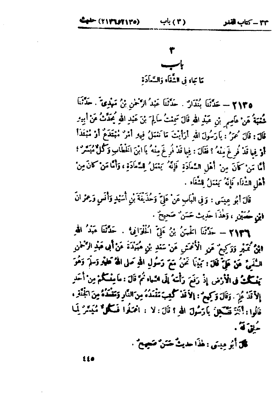 2135 - حَدَّثَنَا بُنْدَارٌ قَالَ: حَدَّثَنَا عَبْدُ الرَّحْمَنِ بْنُ مَهْدِيٍّ قَالَ: حَدَّثَنَا شُعْبَةُ، عَنْ عَاصِمِ بْنِ عُبَيْدِ اللَّهِ، قَالَ: سَمِعْتُ سَالِمَ بْنَ عَبْدِ اللَّهِ يُحَدِّثُ، عَنْ أَبِيهِ، قَالَ: قَالَ عُمَرُ: يَا رَسُولَ اللَّهِ، أَرَأَيْتَ مَا نَعْمَلُ فِيهِ أَمْرٌ مُبْتَدَعٌ أَوْ مُبْتَدَأٌ أَوْ فِيمَا قَدْ فُرِغَ مِنْهُ؟ فَقَالَ: «§فِيمَا قَدْ فُرِغَ مِنْهُ يَا ابْنَ الخَطَّابِ وَكُلٌّ مُيَسَّرٌ، أَمَّا مَنْ كَانَ مِنْ أَهْلِ السَّعَادَةِ فَإِنَّهُ يَعْمَلُ لِلسَّعَادَةِ، وَأَمَّا مَنْ كَانَ مِنْ أَهْلِ الشَّقَاءِ فَإِنَّهُ يَعْمَلُ لِلشَّقَاءِ»: وَفِي البَابِ عَنْ عَلِيٍّ، وَحُذَيْفَةَ بْنِ أَسِيدٍ، وَأَنَسٍ، وَعِمْرَانَ بْنِ حُصَيْنٍ وَهَذَا حَدِيثٌ حَسَنٌ صَحِيحٌ