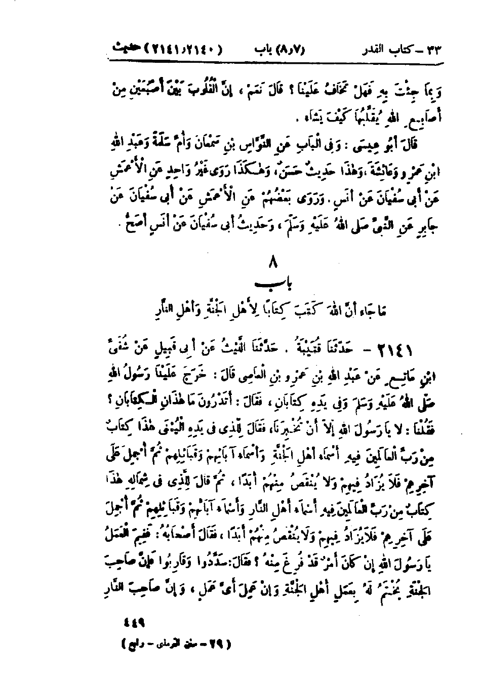 2141 - حَدَّثَنَا قُتَيْبَةُ قَالَ: حَدَّثَنَا اللَّيْثُ، عَنْ أَبِي قَبِيلٍ، عَنْ شُفَيِّ بْنِ مَاتِعٍ، عَنْ عَبْدِ اللَّهِ بْنِ عَمْرِو بْنِ العَاصِ قَالَ: خَرَجَ عَلَيْنَا رَسُولُ اللَّهِ صَلَّى اللَّهُ عَلَيْهِ وَسَلَّمَ وَفِي يَدِهِ كِتَابَانِ، فَقَالَ: «أَتَدْرُونَ مَا هَذَانِ الكِتَابَانِ؟» فَقُلْنَا: لَا يَا رَسُولَ اللَّهِ إِلَّا أَنْ تُخْبِرَنَا، فَقَالَ لِلَّذِي فِي يَدِهِ اليُمْنَى: «§هَذَا كِتَابٌ مِنْ رَبِّ العَالَمِينَ فِيهِ أَسْمَاءُ أَهْلِ الجَنَّةِ وَأَسْمَاءُ آبَائِهِمْ وَقَبَائِلِهِمْ، ثُمَّ أُجْمِلَ عَلَى آخِرِهِمْ فَلَا يُزَادُ فِيهِمْ وَلَا يُنْقَصُ مِنْهُمْ أَبَدًا»، ثُمَّ قَالَ لِلَّذِي فِي شِمَالِهِ: «هَذَا كِتَابٌ مِنْ رَبِّ العَالَمِينَ فِيهِ أَسْمَاءُ أَهْلِ النَّارِ وَأَسْمَاءُ آبَائِهِمْ وَقَبَائِلِهِمْ، ثُمَّ أُجْمِلَ عَلَى آخِرِهِمْ فَلَا يُزَادُ فِيهِمْ وَلَا يُنْقَصُ مِنْهُمْ أَبَدًا»، فَقَالَ أَصْحَابُهُ: فَفِيمَ العَمَلُ يَا رَسُولَ اللَّهِ إِنْ كَانَ أَمْرٌ قَدْ فُرِغَ مِنْهُ؟ فَقَالَ: «سَدِّدُوا وَقَارِبُوا، فَإِنَّ صَاحِبَ الجَنَّةِ يُخْتَمُ لَهُ بِعَمَلِ أَهْلِ الجَنَّةِ وَإِنْ عَمِلَ أَيَّ عَمَلٍ، وَإِنَّ صَاحِبَ النَّارِ -[450]- يُخْتَمُ لَهُ بِعَمَلِ أَهْلِ النَّارِ وَإِنْ عَمِلَ أَيَّ عَمَلٍ»، ثُمَّ قَالَ رَسُولُ اللَّهِ صَلَّى اللَّهُ عَلَيْهِ وَسَلَّمَ بِيَدَيْهِ فَنَبَذَهُمَا، ثُمَّ قَالَ: «فَرَغَ رَبُّكُمْ مِنَ العِبَادِ فَرِيقٌ فِي الجَنَّةِ وَفَرِيقٌ فِي السَّعِيرِ» حَدَّثَنَا قُتَيْبَةُ قَالَ: حَدَّثَنَا بَكْرُ بْنُ مُضَرَ، عَنْ أَبِي قَبِيلٍ، نَحْوَهُ،: وَفِي البَابِ عَنْ ابْنِ عُمَرَ وَهَذَا حَدِيثٌ حَسَنٌ صَحِيحٌ غَرِيبٌ وَأَبُو قَبِيلٍ اسْمُهُ حُيَيُّ بْنُ هَانِئٍ