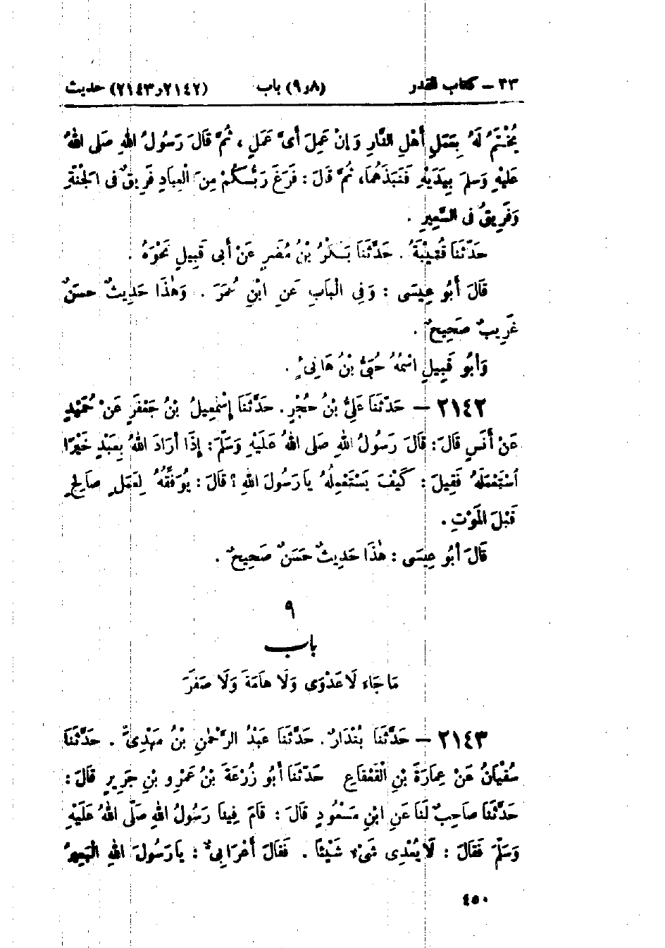 2143 - حَدَّثَنَا بُنْدَارٌ قَالَ: حَدَّثَنَا عَبْدُ الرَّحْمَنِ بْنُ مَهْدِيٍّ قَالَ: حَدَّثَنَا سُفْيَانُ، عَنْ عُمَارَةَ بْنِ القَعْقَاعِ قَالَ: حَدَّثَنَا أَبُو زُرْعَةَ بْنُ عَمْرِو بْنِ جَرِيرٍ قَالَ: حَدَّثَنَا صَاحِبٌ لَنَا، عَنْ ابْنِ مَسْعُودٍ قَالَ: قَامَ فِينَا رَسُولُ اللَّهِ صَلَّى اللَّهُ عَلَيْهِ وَسَلَّمَ فَقَالَ: «§لَا يُعْدِي شَيْءٌ شَيْئًا»، فَقَالَ أَعْرَابِيٌّ: يَا رَسُولَ اللَّهِ، البَعِيرُ -[451]- أَجْرَبُ الْحَشَفَةِ نُدْبِنُهُ، فَتَجْرَبُ الْإِبِلُ كُلُّهَا، فَقَالَ رَسُولُ اللَّهِ صَلَّى اللَّهُ عَلَيْهِ وَسَلَّمَ: «فَمَنْ أَجْرَبَ الأَوَّلَ؟ لَا عَدْوَى وَلَا صَفَرَ، خَلَقَ اللَّهُ كُلَّ نَفْسٍ وَكَتَبَ حَيَاتَهَا وَرِزْقَهَا وَمَصَائِبَهَا»: وَفِي البَابِ عَنْ أَبِي هُرَيْرَةَ، وَابْنِ عَبَّاسٍ، وَأَنَسٍ وسَمِعْت مُحَمَّدَ بْنَ عَمْرِو بْنِ صَفْوَانَ الثَّقَفِيَّ البَصْرِيَّ، قَالَ: سَمِعْتُ عَلِيَّ بْنَ المَدِينِيِّ، يَقُولُ: لَوْ حَلَفْتُ بَيْنَ الرُّكْنِ وَالمَقَامِ لَحَلَفْتُ أَنِّي لَمْ أَرَ أَحَدًا أَعْلَمَ مِنْ عَبْدِ الرَّحْمَنِ بْنِ مَهْدِيٍّ