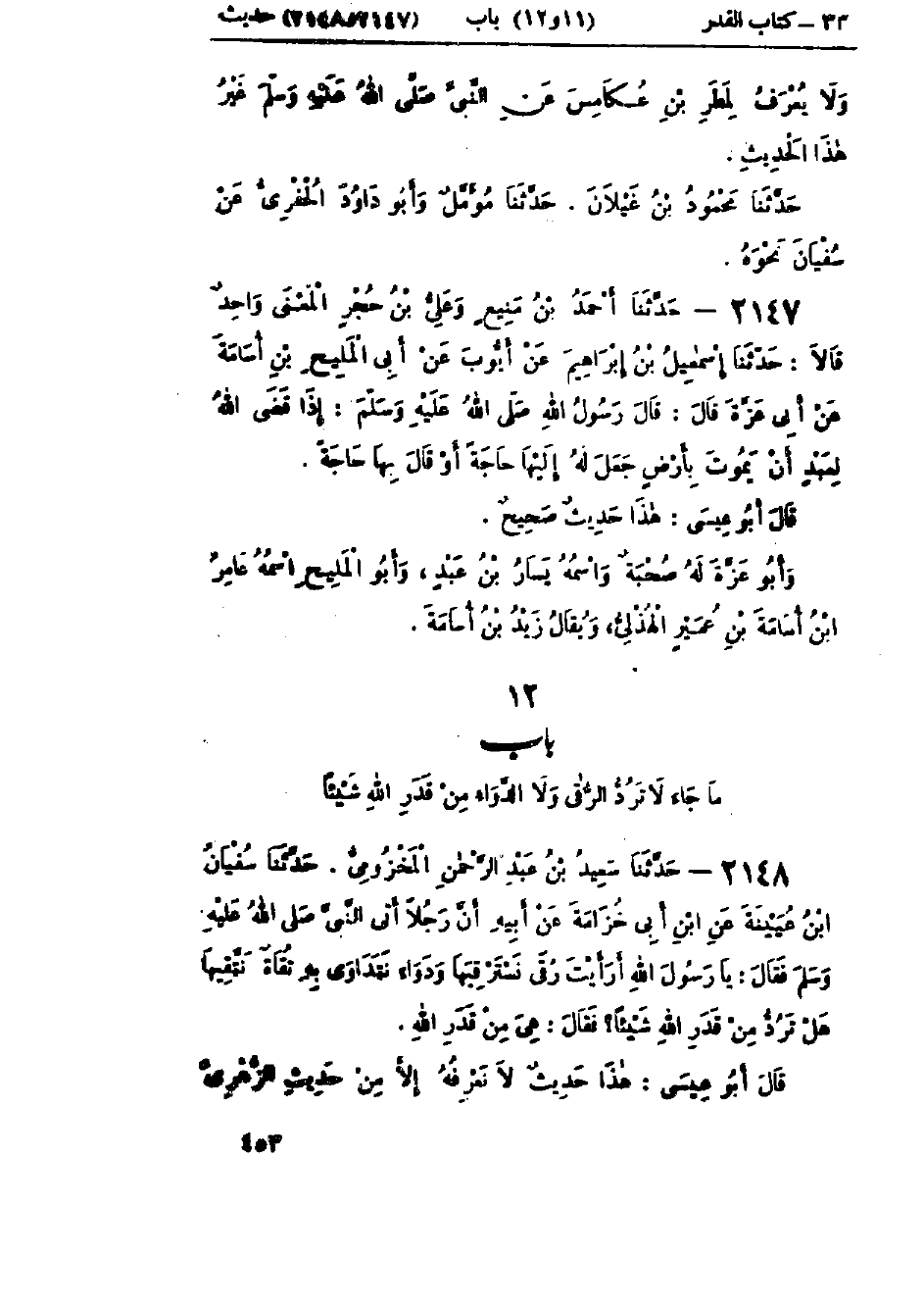 2148 - حَدَّثَنَا سَعِيدُ بْنُ عَبْدِ الرَّحْمَنِ المَخْزُومِيُّ قَالَ: حَدَّثَنَا سُفْيَانُ بْنُ عُيَيْنَةَ، عَنْ الزُّهْرِيِّ، عَنْ ابْنِ أَبِي خُزَامَةَ، عَنْ أَبِيهِ، أَنَّ رَجُلًا أَتَى النَّبِيَّ صَلَّى اللَّهُ عَلَيْهِ وَسَلَّمَ فَقَالَ: يَا رَسُولَ اللَّهِ، أَرَأَيْتَ رُقًى نَسْتَرْقِيهَا وَدَوَاءً نَتَدَاوَى بِهِ وَتُقَاةً نَتَّقِيهَا هَلْ تَرُدُّ مِنْ قَدَرِ اللَّهِ شَيْئًا؟ فَقَالَ: «§هِيَ مِنْ قَدَرِ اللَّهِ»: هَذَا حَدِيثٌ لَا نَعْرِفُهُ إِلَّا مِنْ حَدِيثِ الزُّهْرِيِّ، -[454]- وَقَدْ رَوَى غَيْرُ وَاحِدٍ هَذَا، عَنْ سُفْيَانَ، عَنِ الزُّهْرِيِّ، عَنْ أَبِي خِزَامَةَ، عَنْ أَبِيهِ، وَهَذَا أَصَحُّ هَكَذَا قَالَ غَيْرُ وَاحِدٍ، عَنِ الزُّهْرِيِّ، عَنْ أَبِي خُزَامَةَ، عَنْ أَبِيهِ