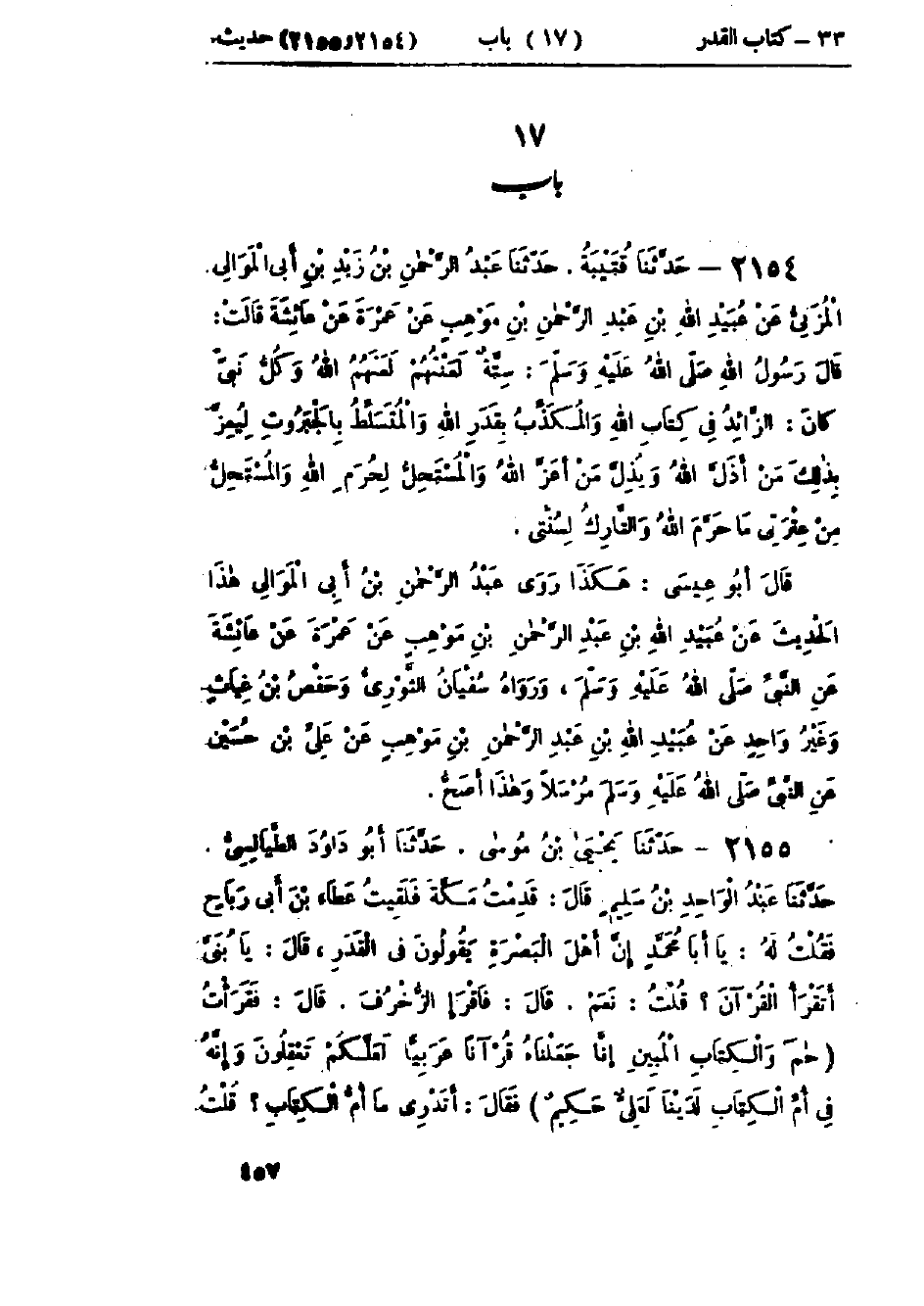 2154 - حَدَّثَنَا قُتَيْبَةُ قَالَ: حَدَّثَنَا عَبْدُ الرَّحْمَنِ بْنُ زَيْدِ بْنِ أَبِي المَوَالِي المُزَنِيُّ، عَنْ عُبَيْدِ اللَّهِ بْنِ عَبْدِ الرَّحْمَنِ بْنِ مَوْهَبٍ، عَنْ عَمْرَةَ، عَنْ عَائِشَةَ قَالَتْ: قَالَ رَسُولُ اللَّهِ صَلَّى اللَّهُ عَلَيْهِ وَسَلَّمَ: " §سِتَّةٌ لَعَنْتُهُمْ وَلَعَنَهُمُ اللَّهُ وَكُلُّ نَبِيٍّ كَانَ: الزَّائِدُ فِي كِتَابِ اللَّهِ، وَالمُكَذِّبُ بِقَدَرِ اللَّهِ، وَالمُتَسَلِّطُ بِالجَبَرُوتِ لِيُعِزَّ بِذَلِكَ مَنْ أَذَلَّ اللَّهُ، وَيُذِلَّ مَنْ أَعَزَّ اللَّهُ، وَالمُسْتَحِلُّ لِحُرُمِ اللَّهِ، وَالمُسْتَحِلُّ مِنْ عِتْرَتِي مَا حَرَّمَ اللَّهُ، وَالتَّارِكُ لِسُنَّتِي ": هَكَذَا رَوَى عَبْدُ الرَّحْمَنِ بْنُ أَبِي المَوَالِي هَذَا الحَدِيثَ، عَنْ عُبَيْدِ اللَّهِ بْنِ عَبْدِ الرَّحْمَنِ بْنِ مَوْهَبٍ، عَنْ عَمْرَةَ، عَنْ عَائِشَةَ، عَنِ النَّبِيِّ صَلَّى اللَّهُ عَلَيْهِ وَسَلَّمَ، وَرَوَاهُ سُفْيَانُ الثَّوْرِيُّ، وَحَفْصُ بْنُ غِيَاثٍ، وَغَيْرُ وَاحِدٍ، عَنْ عُبَيْدِ اللَّهِ بْنِ عَبْدِ الرَّحْمَنِ بْنِ مَوْهَبٍ، عَنْ عَلِيِّ بْنِ حُسَيْنٍ، عَنِ النَّبِيِّ صَلَّى اللَّهُ عَلَيْهِ وَسَلَّمَ مُرْسَلًا وَهَذَا أَصَحُّ