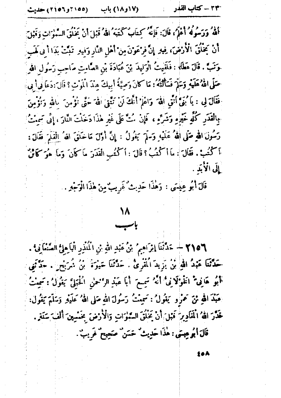 2156 - حَدَّثَنَا إِبْرَاهِيمُ بْنُ عَبْدِ اللَّهِ بْنِ المُنْذِرِ البَاهِلِيُّ الصَّنْعَانِيُّ قَالَ: حَدَّثَنَا عَبْدُ اللَّهِ بْنُ يَزِيدَ المُقْرِئُ قَالَ: حَدَّثَنَا حَيْوَةُ بْنُ شُرَيْحٍ قَالَ: حَدَّثَنِي أَبُو هَانِئٍ الخَوْلَانِيُّ، أَنَّهُ سَمِعَ أَبَا عَبْدِ الرَّحْمَنِ الحُبُلِيَّ يَقُولُ: سَمِعْتُ عَبْدَ اللَّهِ بْنَ عَمْرٍو يَقُولُ: سَمِعْتُ رَسُولَ اللَّهِ صَلَّى اللَّهُ عَلَيْهِ وَسَلَّمَ يَقُولُ: «§قَدَّرَ اللَّهُ المَقَادِيرَ قَبْلَ أَنْ يَخْلُقَ السَّمَوَاتِ وَالأَرْضَ بِخَمْسِينَ أَلْفَ سَنَةٍ»: هَذَا حَدِيثٌ حَسَنٌ صَحِيحٌ غَرِيبٌ