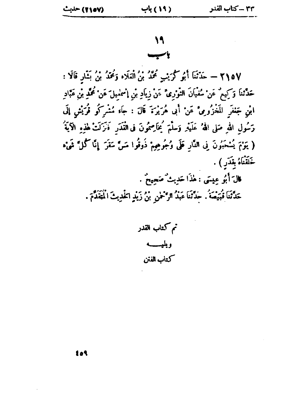 2157 - حَدَّثَنَا أَبُو كُرَيْبٍ مُحَمَّدُ بْنُ العَلَاءِ، وَمُحَمَّدُ بْنُ بَشَّارٍ، قَالَا: حَدَّثَنَا وَكِيعٌ، عَنْ سُفْيَانَ الثَّوْرِيِّ، عَنْ زِيَادِ بْنِ إِسْمَاعِيلَ، عَنْ مُحَمَّدِ بْنِ عَبَّادِ بْنِ جَعْفَرٍ المَخْزُومِيِّ، عَنْ أَبِي هُرَيْرَةَ قَالَ: جَاءَ مُشْرِكُو قُرَيْشٍ إِلَى رَسُولِ اللَّهِ صَلَّى اللَّهُ عَلَيْهِ وَسَلَّمَ يُخَاصِمُونَ فِي القَدَرِ فَنَزَلَتْ هَذِهِ الآيَةُ: " {§يَوْمَ يُسْحَبُونَ فِي النَّارِ عَلَى وُجُوهِهِمْ ذُوقُوا مَسَّ سَقَرَ إِنَّا كُلَّ شَيْءٍ خَلَقْنَاهُ بِقَدَرٍ} [القمر: 49] ": هَذَا حَدِيثٌ حَسَنٌ صَحِيحٌ