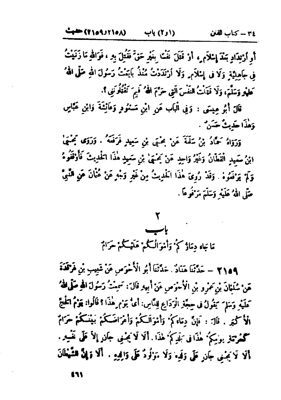 2159 - حَدَّثَنَا هَنَّادٌ قَالَ: حَدَّثَنَا أَبُو الأَحْوَصِ، عَنْ شَبِيبِ بْنِ غَرْقَدَةَ، عَنْ سُلَيْمَانَ بْنِ عَمْرِو بْنِ الأَحْوَصِ، عَنْ أَبِيهِ، قَالَ: سَمِعْتُ رَسُولَ اللَّهِ صَلَّى اللَّهُ عَلَيْهِ وَسَلَّمَ يَقُولُ فِي حَجَّةِ الوَدَاعِ لِلنَّاسِ: «أَيُّ يَوْمٍ هَذَا؟» قَالُوا: يَوْمُ الحَجِّ الأَكْبَرِ، قَالَ: «فَإِنَّ §دِمَاءَكُمْ وَأَمْوَالَكُمْ وَأَعْرَاضَكُمْ بَيْنَكُمْ حَرَامٌ كَحُرْمَةِ يَوْمِكُمْ هَذَا فِي بَلَدِكُمْ هَذَا، أَلَا لَا يَجْنِي جَانٍ إِلَّا عَلَى نَفْسِهِ، أَلَا لَا يَجْنِي جَانٍ عَلَى وَلَدِهِ وَلَا مَوْلُودٌ عَلَى وَالِدِهِ، أَلَا وَإِنَّ الشَّيْطَانَ -[462]- قَدْ أَيِسَ مِنْ أَنْ يُعْبَدَ فِي بِلَادِكُمْ هَذِهِ أَبَدًا وَلَكِنْ سَتَكُونُ لَهُ طَاعَةٌ فِيمَا تَحْتَقِرُونَ مِنْ أَعْمَالِكُمْ فَسَيَرْضَى بِهِ»: وَفِي البَابِ عَنْ أَبِي بَكْرَةَ، وَابْنِ عَبَّاسٍ، وَجَابِرٍ، وَحِذْيَمِ بْنِ عَمْرٍو السَّعْدِيِّ وَهَذَا حَدِيثٌ حَسَنٌ صَحِيحٌ وَرَوَى زَائِدَةُ، عَنْ شَبِيبِ بْنِ غَرْقَدَةَ، نَحْوَهُ، وَلَا نَعْرِفُهُ إِلَّا مِنْ حَدِيثِ شَبِيبِ بْنِ غَرْقَدَةَ
