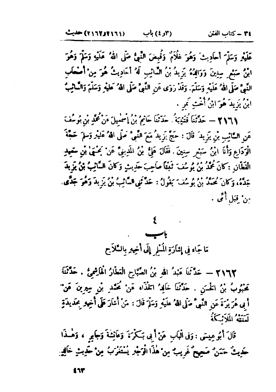 2162 - حَدَّثَنَا عَبْدُ اللَّهِ بْنُ الصَّبَّاحِ العَطَّارُ الهَاشِمِيُّ قَالَ: حَدَّثَنَا مَحْبُوبُ بْنُ الحَسَنِ قَالَ: حَدَّثَنَا خَالِدٌ الحَذَّاءُ، عَنْ مُحَمَّدِ بْنِ سِيرِينَ، عَنْ أَبِي هُرَيْرَةَ، عَنِ النَّبِيِّ صَلَّى اللَّهُ عَلَيْهِ وَسَلَّمَ قَالَ: «§مَنْ أَشَارَ عَلَى أَخِيهِ بِحَدِيدَةٍ لَعَنَتْهُ المَلَائِكَةُ»: وَفِي البَابِ عَنْ أَبِي بَكْرَةَ، وَعَائِشَةَ، وَجَابِرٍ، وَهَذَا حَدِيثٌ حَسَنٌ صَحِيحٌ غَرِيبٌ مِنْ هَذَا الوَجْهِ يُسْتَغْرَبُ مِنْ حَدِيثِ خَالِدٍ -[464]- الحَذَّاءِ وَرَوَاهُ أَيُّوبُ، عَنْ مُحَمَّدِ بْنِ سِيرِينَ، عَنْ أَبِي هُرَيْرَةَ، نَحْوَهُ، وَلَمْ يَرْفَعْهُ وَزَادَ فِيهِ: «وَإِنْ كَانَ أَخَاهُ لِأَبِيهِ وَأُمِّهِ» حَدَّثَنَا بِذَلِكَ قُتَيْبَةُ قَالَ: حَدَّثَنَا حَمَّادُ بْنُ زَيْدٍ، عَنْ أَيُّوبَ بِهَذَا