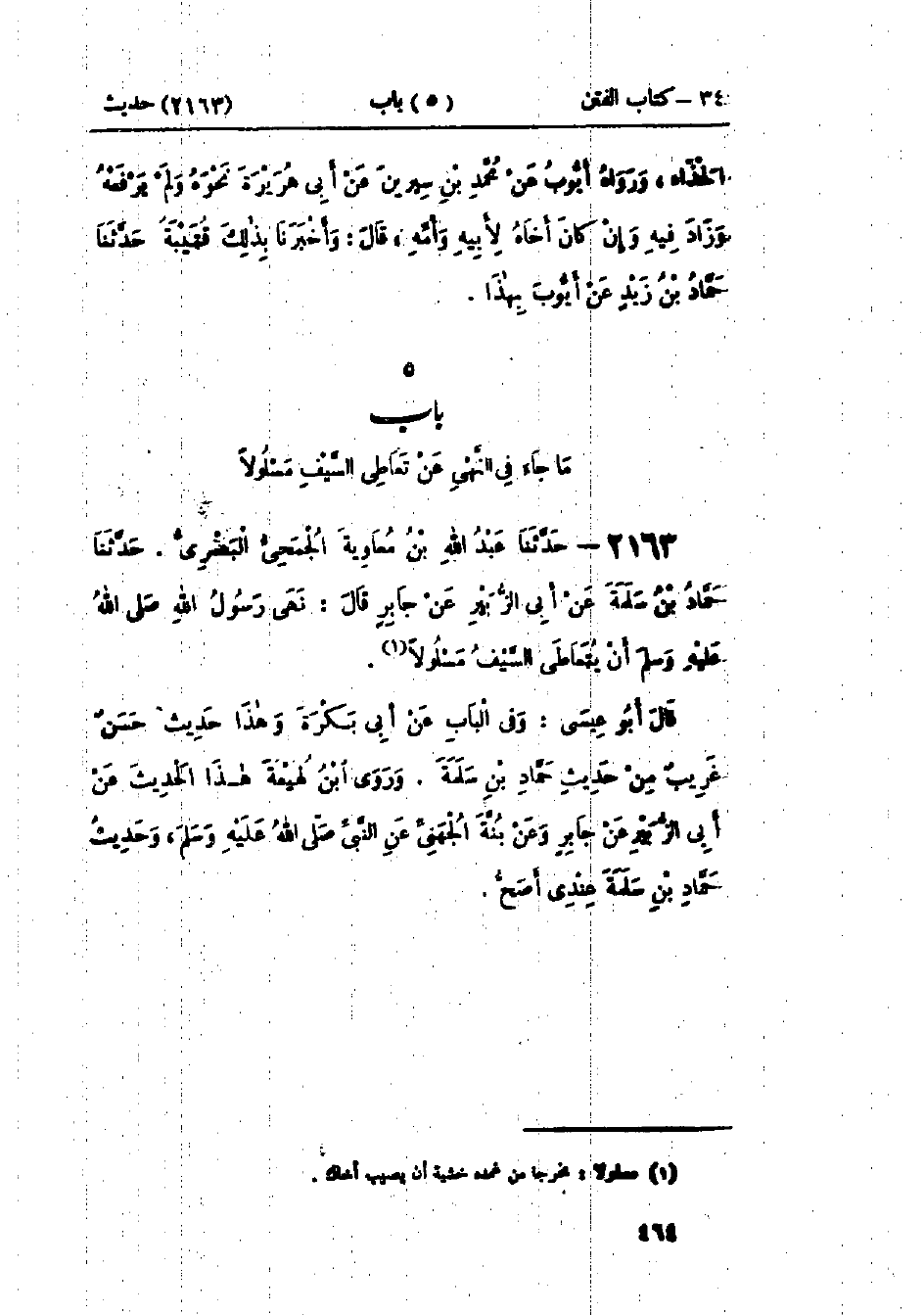 2163 - حَدَّثَنَا عَبْدُ اللَّهِ بْنُ مُعَاوِيَةَ الجُمَحِيُّ البَصْرِيُّ قَالَ: حَدَّثَنَا حَمَّادُ بْنُ سَلَمَةَ، عَنْ أَبِي الزُّبَيْرِ، عَنْ جَابِرٍ قَالَ: «§نَهَى رَسُولُ اللَّهِ صَلَّى اللَّهُ عَلَيْهِ وَسَلَّمَ أَنْ يُتَعَاطَى السَّيْفُ مَسْلُولًا»: وَفِي البَابِ عَنْ أَبِي بَكْرَةَ وَهَذَا حَدِيثٌ حَسَنٌ غَرِيبٌ مِنْ حَدِيثِ حَمَّادِ بْنِ سَلَمَةَ وَرَوَى ابْنُ لَهِيعَةَ هَذَا الحَدِيثَ، عَنْ أَبِي الزُّبَيْرِ، عَنْ جَابِرٍ، عَنْ بَنَّةَ الجُهَنِيِّ، عَنِ النَّبِيِّ صَلَّى اللَّهُ عَلَيْهِ وَسَلَّمَ، وَحَدِيثُ حَمَّادِ بْنِ سَلَمَةَ عِنْدِي أَصَحُّ