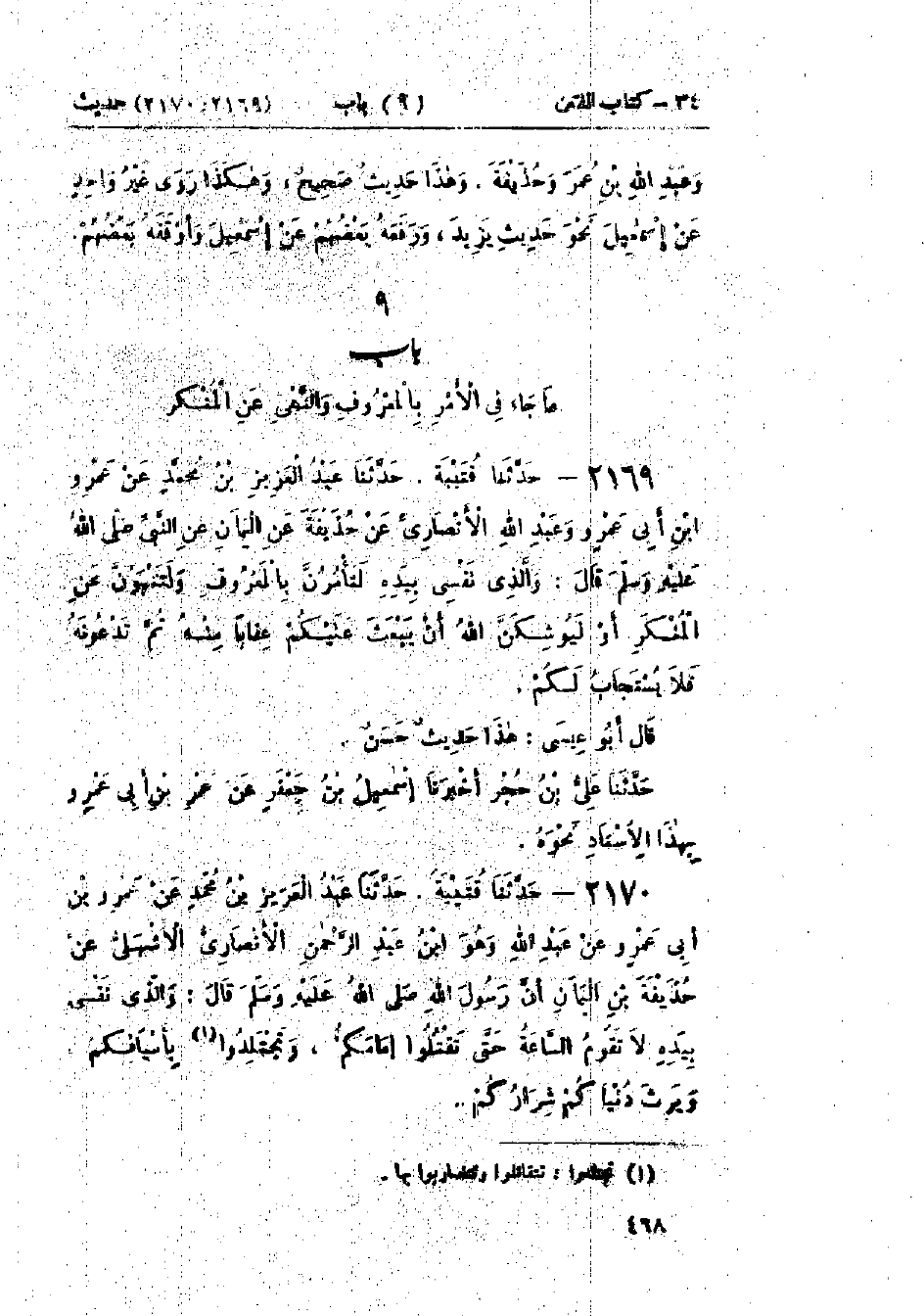 2169 - حَدَّثَنَا قُتَيْبَةُ قَالَ: حَدَّثَنَا عَبْدُ العَزِيزِ بْنُ مُحَمَّدٍ، عَنْ عَمْرِو بْنِ أَبِي عَمْرٍو، عَنْ عَبْدِ اللَّهِ الأَنْصَارِيِّ، عَنْ حُذَيْفَةَ بْنِ اليَمَانِ، عَنِ النَّبِيِّ صَلَّى اللَّهُ عَلَيْهِ وَسَلَّمَ قَالَ: «وَالَّذِي نَفْسِي بِيَدِهِ §لَتَأْمُرُنَّ بِالمَعْرُوفِ وَلَتَنْهَوُنَّ عَنِ المُنْكَرِ أَوْ لَيُوشِكَنَّ اللَّهُ أَنْ يَبْعَثَ عَلَيْكُمْ عِقَابًا مِنْهُ ثُمَّ تَدْعُونَهُ فَلَا يُسْتَجَابُ لَكُمْ»: هَذَا حَدِيثٌ حَسَنٌ حَدَّثَنَا عَلِيُّ بْنُ حُجْرٍ قَالَ: أَخْبَرَنَا إِسْمَاعِيلُ بْنُ جَعْفَرٍ، عَنْ عَمْرِو بْنِ أَبِي عَمْرٍو، بِهَذَا الإِسْنَادِ نَحْوَهُ