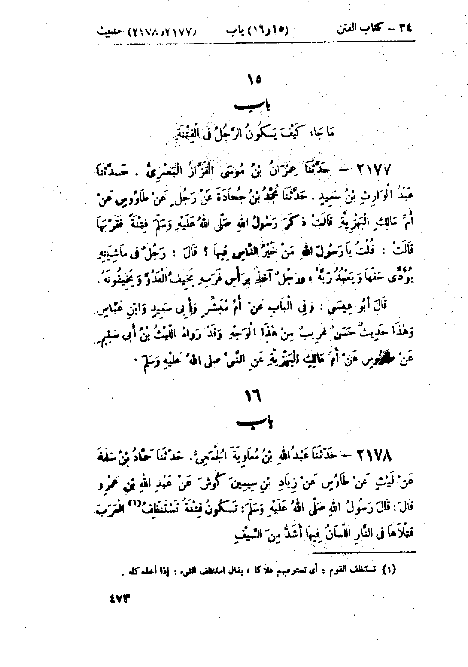 2178 - حَدَّثَنَا عَبْدُ اللَّهِ بْنُ مُعَاوِيَةَ الجُمَحِيُّ قَالَ: حَدَّثَنَا حَمَّادُ بْنُ سَلَمَةَ، عَنْ لَيْثٍ، عَنْ طَاوُسٍ، عَنْ زِيَادِ بْنِ سِيْمِينَ كُوْشَ، عَنْ عَبْدِ اللَّهِ بْنِ عَمْرٍو قَالَ: قَالَ رَسُولُ اللَّهِ صَلَّى اللَّهُ عَلَيْهِ وَسَلَّمَ: «§تَكُونُ فِتْنَةٌ تَسْتَنْظِفُ العَرَبُ قَتْلَاهَا فِي النَّارِ، اللِّسَانُ فِيهَا أَشَدُّ مِنَ السَّيْفِ»: -[474]- هَذَا حَدِيثٌ غَرِيبٌ، سَمِعْت مُحَمَّدَ بْنَ إِسْمَاعِيلَ يَقُولُ: لَا يُعْرَفُ لِزِيَادِ بْنِ سِيْمِينَ كُوْشَ غَيْرُ هَذَا الحَدِيثِ، رَوَاهُ حَمَّادُ بْنُ سَلَمَةَ، عَنْ لَيْثٍ فَرَفَعَهُ، وَرَوَاهُ حَمَّادُ بْنُ زَيْدٍ، عَنْ لَيْثٍ فَأَوْقَفَهُ