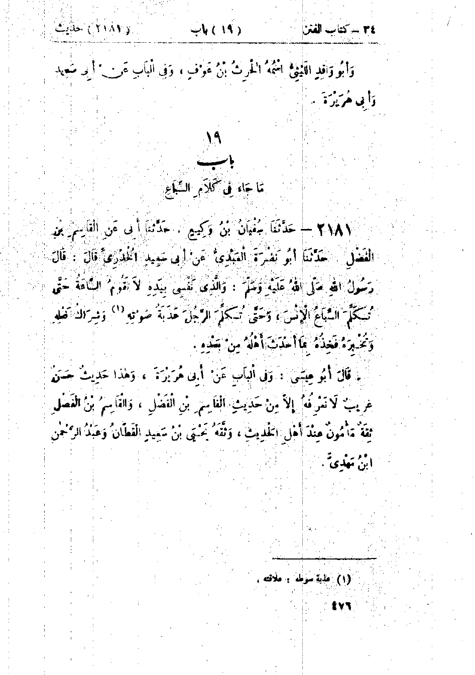 2181 - حَدَّثَنَا سُفْيَانُ بْنُ وَكِيعٍ قَالَ: حَدَّثَنَا أَبِي، عَنْ القَاسِمِ بْنِ الفَضْلِ قَالَ: حَدَّثَنَا أَبُو نَضْرَةَ العَبْدِيُّ، عَنْ أَبِي سَعِيدٍ الخُدْرِيِّ قَالَ: قَالَ رَسُولُ اللَّهِ صَلَّى اللَّهُ عَلَيْهِ وَسَلَّمَ: «وَالَّذِي نَفْسِي بِيَدِهِ §لَا تَقُومُ السَّاعَةُ حَتَّى تُكَلِّمَ السِّبَاعُ الإِنْسَ، وَحَتَّى تُكَلِّمَ الرَّجُلَ عَذَبَةُ سَوْطِهِ وَشِرَاكُ نَعْلِهِ وَتُخْبِرَهُ فَخِذُهُ بِمَا أَحْدَثَ أَهْلُهُ مِنْ بَعْدِهِ»: وَفِي البَابِ عَنْ أَبِي هُرَيْرَةَ وَهَذَا حَدِيثٌ حَسَنٌ صَحِيحٌ غَرِيبٌ لَا نَعْرِفُهُ إِلَّا مِنْ حَدِيثِ القَاسِمِ بْنِ الفَضْلِ، وَالقَاسِمُ بْنُ الفَضْلِ ثِقَةٌ مَأْمُونٌ عِنْدَ أَهْلِ الحَدِيثِ وَثَّقَهُ يَحْيَى بْنُ سَعِيدٍ القَطَّانُ وَعَبْدُ الرَّحْمَنِ بْنُ مَهْدِيٍّ