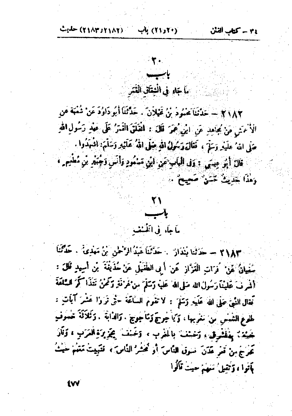 2182 - حَدَّثَنَا مَحْمُودُ بْنُ غَيْلَانَ قَالَ: حَدَّثَنَا أَبُو دَاوُدَ، عَنْ شُعْبَةَ، عَنْ الأَعْمَشِ، عَنْ مُجَاهِدٍ، عَنْ ابْنِ عُمَرَ قَالَ: §انْفَلَقَ القَمَرُ عَلَى عَهْدِ رَسُولِ اللَّهِ صَلَّى اللَّهُ عَلَيْهِ وَسَلَّمَ، فَقَالَ رَسُولُ اللَّهِ صَلَّى اللَّهُ عَلَيْهِ وَسَلَّمَ: «اشْهَدُوا»: وَفِي البَابِ عَنْ ابْنِ مَسْعُودٍ، وَأَنَسٍ، وَجُبَيْرِ بْنِ مُطْعِمٍ وَهَذَا حَدِيثٌ حَسَنٌ صَحِيحٌ