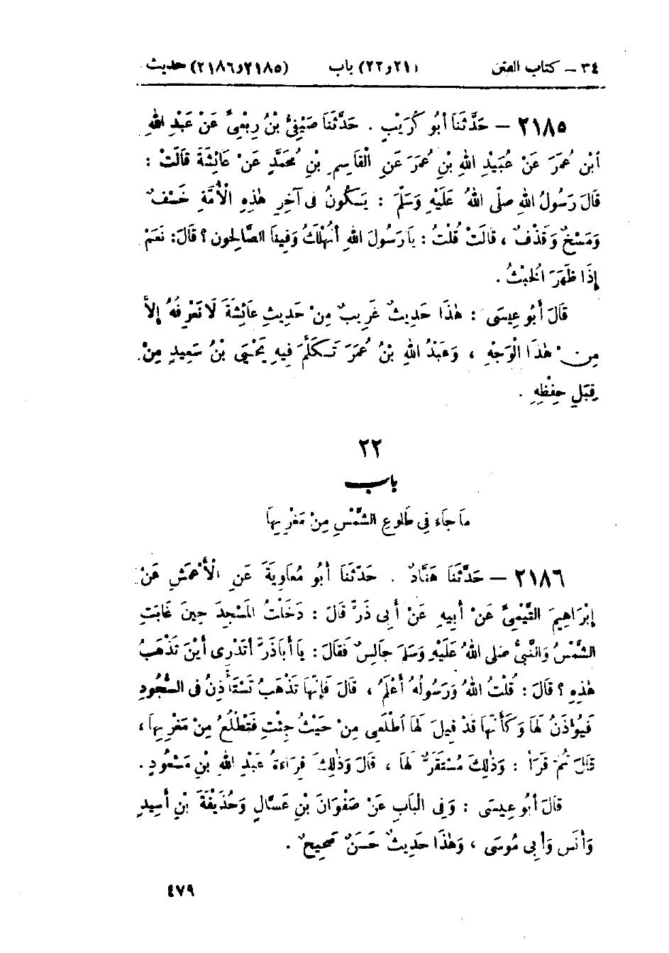 2186 - حَدَّثَنَا هَنَّادٌ قَالَ: حَدَّثَنَا أَبُو مُعَاوِيَةَ، عَنْ الأَعْمَشِ، عَنْ إِبْرَاهِيمَ التَّيْمِيِّ، عَنْ أَبِيهِ، عَنْ أَبِي ذَرٍّ قَالَ: دَخَلْتُ المَسْجِدَ حِينَ غَابَتِ الشَّمْسُ وَالنَّبِيُّ صَلَّى اللَّهُ عَلَيْهِ وَسَلَّمَ جَالِسٌ، فَقَالَ: «يَا أَبَا ذَرٍّ، §أَتَدْرِي أَيْنَ تَذْهَبُ هَذِهِ؟» قَالَ: قُلْتُ: اللَّهُ وَرَسُولُهُ أَعْلَمُ، قَالَ: «فَإِنَّهَا تَذْهَبُ تَسْتَأْذِنُ فِي السُّجُودِ فَيُؤْذَنُ لَهَا وَكَأَنَّهَا قَدْ قِيلَ لَهَا اطْلُعِي مِنْ حَيْثُ جِئْتِ فَتَطْلُعُ مِنْ مَغْرِبِهَا» قَالَ: ثُمَّ قَرَأَ «وَذَلِكَ مُسْتَقَرٌّ لَهَا»، قَالَ: وَذَلِكَ قِرَاءَةُ عَبْدِ اللَّهِ بْنِ مَسْعُودٍ: وَفِي البَابِ عَنْ صَفْوَانَ بْنِ عَسَّالٍ، وَحُذَيْفَةَ بْنِ أَسِيدٍ، وَأَنَسٍ، وَأَبِي مُوسَى وَهَذَا حَدِيثٌ حَسَنٌ صَحِيحٌ