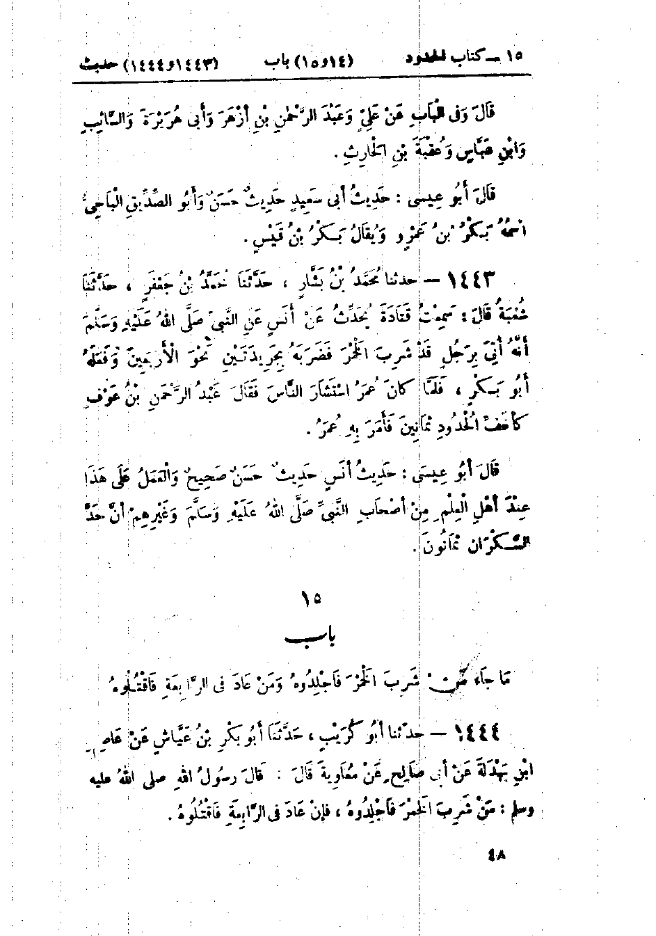 1443 - حَدَّثَنَا مُحَمَّدُ بْنُ بَشَّارٍ قَالَ: حَدَّثَنَا مُحَمَّدُ بْنُ جَعْفَرٍ، حَدَّثَنَا شُعْبَةُ، قَالَ: سَمِعْتُ قَتَادَةَ، يُحَدِّثُ، عَنْ أَنَسٍ، عَنِ النَّبِيِّ صَلَّى اللَّهُ عَلَيْهِ وَسَلَّمَ أَنَّهُ «§أُتِيَ بِرَجُلٍ قَدْ شَرِبَ الخَمْرَ فَضَرَبَهُ بِجَرِيدَتَيْنِ نَحْوَ الأَرْبَعِينَ»، وَفَعَلَهُ أَبُو بَكْرٍ، فَلَمَّا كَانَ عُمَرُ اسْتَشَارَ النَّاسَ، فَقَالَ عَبْدُ الرَّحْمَنِ بْنُ عَوْفٍ: كَأَخَفِّ الحُدُودِ ثَمَانِينَ، فَأَمَرَ بِهِ عُمَرُ: حَدِيثُ أَنَسٍ حَدِيثٌ حَسَنٌ صَحِيحٌ وَالعَمَلُ عَلَى هَذَا عِنْدَ أَهْلِ العِلْمِ مِنْ أَصْحَابِ النَّبِيِّ صَلَّى اللَّهُ عَلَيْهِ وَسَلَّمَ، وَغَيْرِهِمْ: أَنَّ حَدَّ السَّكْرَانِ ثَمَانُونَ