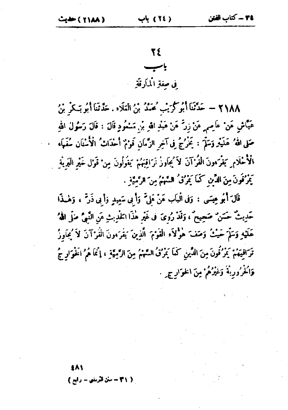 2188 - حَدَّثَنَا أَبُو كُرَيْبٍ مُحَمَّدُ بْنُ العَلَاءِ قَالَ: حَدَّثَنَا أَبُو بَكْرِ بْنُ عَيَّاشٍ، عَنْ عَاصِمٍ، عَنْ زِرٍّ، عَنْ عَبْدِ اللَّهِ بْنِ مَسْعُودٍ قَالَ: قَالَ رَسُولُ اللَّهِ صَلَّى اللَّهُ عَلَيْهِ وَسَلَّمَ: «§يَخْرُجُ فِي آخِرِ الزَّمَانِ قَوْمٌ أَحْدَاثُ الأَسْنَانِ سُفَهَاءُ الأَحْلَامِ، يَقْرَءُونَ القُرْآنَ، لَا يُجَاوِزُ تَرَاقِيَهُمْ، يَقُولُونَ مِنْ قَوْلِ خَيْرِ البَرِيَّةِ، يَمْرُقُونَ مِنَ الدِّينِ كَمَا يَمْرُقُ السَّهْمُ مِنَ الرَّمِيَّةِ»: وَفِي البَابِ عَنْ عَلِيٍّ، وَأَبِي سَعِيدٍ، وَأَبِي ذَرٍّ وَهَذَا حَدِيثٌ حَسَنٌ صَحِيحٌ وَقَدْ رُوِيَ فِي غَيْرِ هَذَا الحَدِيثِ عَنِ النَّبِيِّ صَلَّى اللَّهُ عَلَيْهِ وَسَلَّمَ حَيْثُ وَصَفَ هَؤُلَاءِ القَوْمَ الَّذِينَ يَقْرَءُونَ القُرْآنَ لَا يُجَاوِزُ تَرَاقِيَهُمْ، يَمْرُقُونَ مِنَ الدِّينِ كَمَا يَمْرُقُ السَّهْمُ مِنَ الرَّمِيَّةِ، إِنَّمَا هُمُ الْخَوَارِجُ وَالْحَرُورِيَّةُ وَغَيْرُهُمْ مِنَ الْخَوَارِجِ