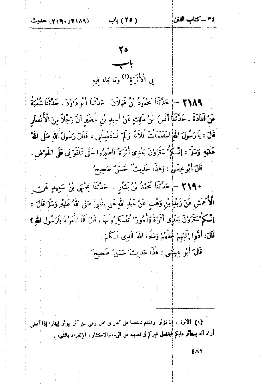 2189 - حَدَّثَنَا مَحْمُودُ بْنُ غَيْلَانَ قَالَ: حَدَّثَنَا أَبُو دَاوُدَ قَالَ: حَدَّثَنَا شُعْبَةُ، عَنْ قَتَادَةَ قَالَ: حَدَّثَنَا أَنَسُ بْنُ مَالِكٍ، عَنْ أُسَيْدِ بْنِ حُضَيْرٍ، أَنَّ رَجُلًا مِنَ الأَنْصَارِ قَالَ: يَا رَسُولَ اللَّهِ، اسْتَعْمَلْتَ فُلَانًا وَلَمْ تَسْتَعْمِلْنِي، فَقَالَ رَسُولُ اللَّهِ صَلَّى اللَّهُ عَلَيْهِ وَسَلَّمَ: «إِنَّكُمْ §سَتَرَوْنَ بَعْدِي أَثَرَةً فَاصْبِرُوا حَتَّى تَلْقَوْنِي عَلَى الحَوْضِ»: وَهَذَا حَدِيثٌ حَسَنٌ صَحِيحٌ