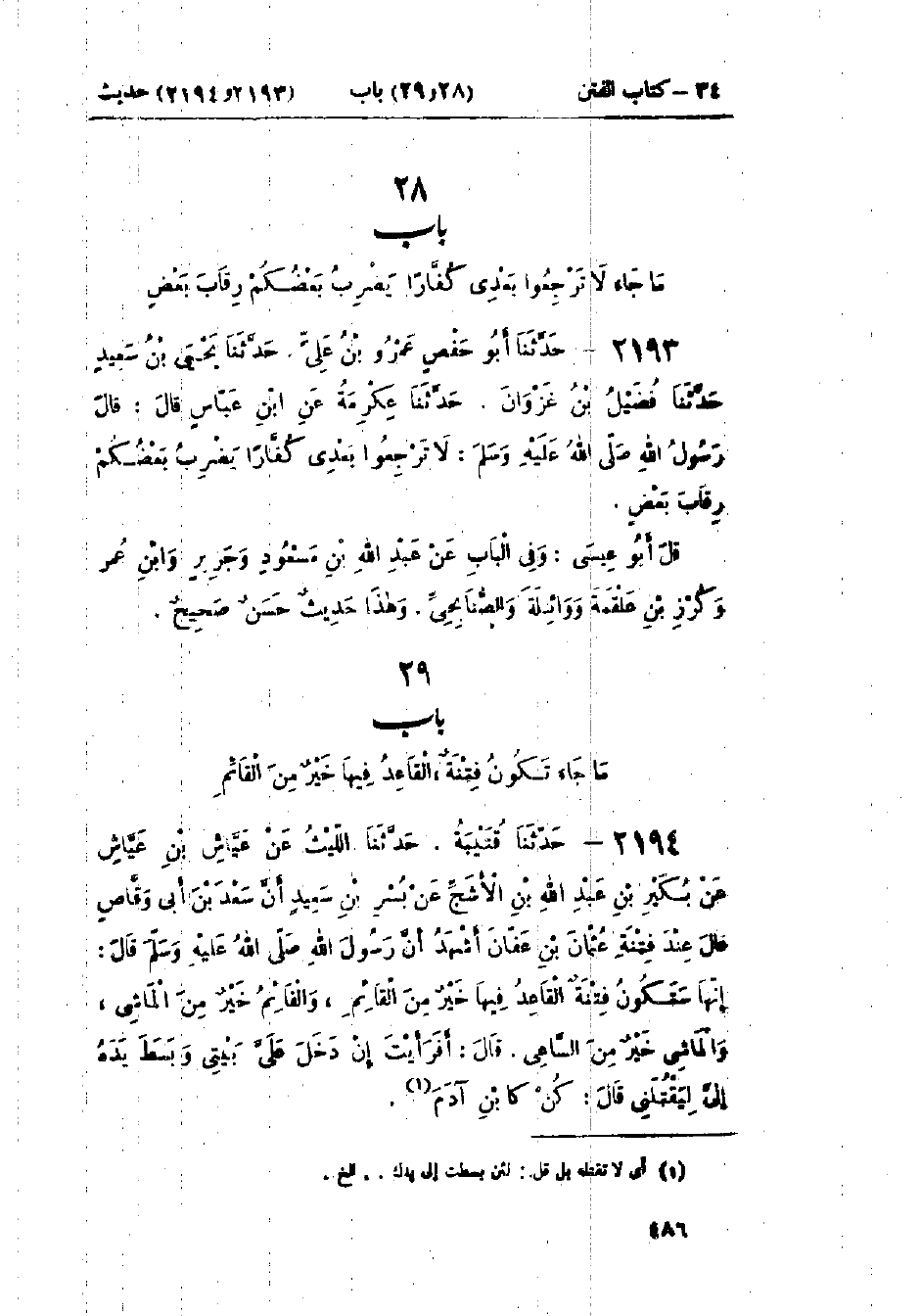 2193 - حَدَّثَنَا أَبُو حَفْصٍ عَمْرُو بْنُ عَلِيٍّ قَالَ: حَدَّثَنَا يَحْيَى بْنُ سَعِيدٍ قَالَ: حَدَّثَنَا فُضَيْلُ بْنُ غَزْوَانَ قَالَ: حَدَّثَنَا عِكْرِمَةُ، عَنْ ابْنِ عَبَّاسٍ قَالَ: قَالَ رَسُولُ اللَّهِ صَلَّى اللَّهُ عَلَيْهِ وَسَلَّمَ: «§لَا تَرْجِعُوا بَعْدِي كُفَّارًا يَضْرِبُ بَعْضُكُمْ رِقَابَ بَعْضٍ»: وَفِي البَابِ عَنْ عَبْدِ اللَّهِ بْنِ مَسْعُودٍ، وَجَرِيرٍ وَابْنِ عُمَرَ، وَكُرْزِ بْنِ عَلْقَمَةَ، وَوَاثِلَةَ، وَالصُّنَابِحِيِّ وَهَذَا حَدِيثٌ حَسَنٌ صَحِيحٌ