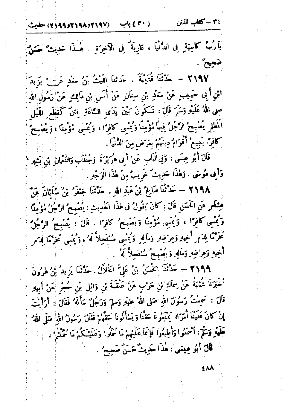 2197 - حَدَّثَنَا قُتَيْبَةُ قَالَ: حَدَّثَنَا اللَّيْثُ بْنُ سَعْدٍ، عَنْ يَزِيدَ بْنِ أَبِي حَبِيبٍ، عَنْ سَعْدِ بْنِ سِنَانٍ، عَنْ أَنَسِ بْنِ مَالِكٍ، عَنْ رَسُولِ اللَّهِ صَلَّى اللَّهُ عَلَيْهِ وَسَلَّمَ قَالَ: «§تَكُونُ بَيْنَ يَدَيِ السَّاعَةِ فِتَنٌ كَقِطَعِ اللَّيْلِ المُظْلِمِ يُصْبِحُ الرَّجُلُ فِيهَا مُؤْمِنًا وَيُمْسِي كَافِرًا، وَيُمْسِي مُؤْمِنًا وَيُصْبِحُ كَافِرًا، يَبِيعُ أَقْوَامٌ دِينَهُمْ بِعَرَضٍ مِنَ الدُّنْيَا»: وَفِي البَابِ عَنْ أَبِي هُرَيْرَةَ، وَجُنْدَبٍ، وَالنُّعْمَانِ بْنِ بَشِيرٍ، وَأَبِي مُوسَى وَهَذَا حَدِيثٌ غَرِيبٌ مِنْ هَذَا الوَجْهِ