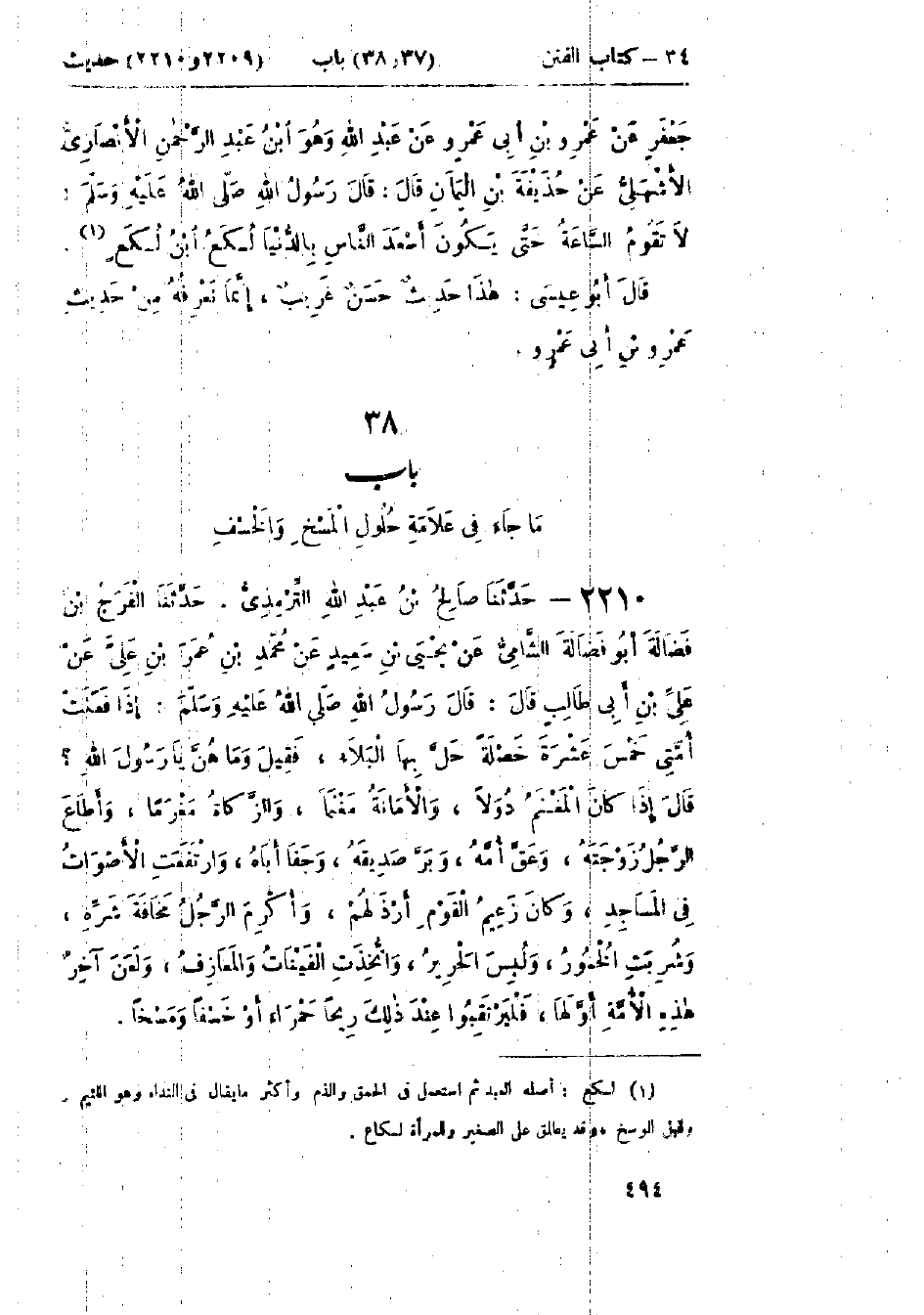 2210 - حَدَّثَنَا صَالِحُ بْنُ عَبْدِ اللَّهِ التِّرْمِذِيُّ قَالَ: حَدَّثَنَا الفَرَجُ بْنُ فَضَالَةَ أَبُو فَضَالَةَ الشَّامِيُّ، عَنْ يَحْيَى بْنِ سَعِيدٍ، عَنْ مُحَمَّدِ بْنِ عَمْرِو بْنِ عَلِيٍّ، عَنْ عَلِيِّ بْنِ أَبِي طَالِبٍ قَالَ: قَالَ رَسُولُ اللَّهِ صَلَّى اللَّهُ عَلَيْهِ وَسَلَّمَ: «§إِذَا فَعَلَتْ أُمَّتِي خَمْسَ عَشْرَةَ خَصْلَةً حَلَّ بِهَا البَلَاءُ» فَقِيلَ: وَمَا هُنَّ يَا رَسُولَ اللَّهِ؟ قَالَ: «إِذَا كَانَ المَغْنَمُ دُوَلًا، وَالأَمَانَةُ مَغْنَمًا، وَالزَّكَاةُ مَغْرَمًا، وَأَطَاعَ الرَّجُلُ زَوْجَتَهُ، وَعَقَّ أُمَّهُ، وَبَرَّ صَدِيقَهُ، وَجَفَا أَبَاهُ، وَارْتَفَعَتِ الأَصْوَاتُ فِي المَسَاجِدِ، وَكَانَ زَعِيمُ القَوْمِ أَرْذَلَهُمْ، وَأُكْرِمَ الرَّجُلُ مَخَافَةَ شَرِّهِ، وَشُرِبَتِ الخُمُورُ، وَلُبِسَ الحَرِيرُ، وَاتُّخِذَتِ القَيْنَاتُ وَالمَعَازِفُ، وَلَعَنَ آخِرُ هَذِهِ الأُمَّةِ أَوَّلَهَا، فَلْيَرْتَقِبُوا عِنْدَ ذَلِكَ رِيحًا حَمْرَاءَ أَوْ خَسْفًا وَمَسْخًا»: -[495]- هَذَا حَدِيثٌ غَرِيبٌ لَا نَعْرِفُهُ مِنْ حَدِيثِ عَلِيِّ بْنِ أَبِي طَالِبٍ إِلَّا مِنْ هَذَا الوَجْهِ وَلَا نَعْلَمُ أَحَدًا رَوَاهُ عَنْ يَحْيَى بْنِ سَعِيدٍ الأَنْصَارِيِّ غَيْرَ الفَرَجِ بْنِ فَضَالَةَ وَالفَرَجُ بْنُ فَضَالَةَ قَدْ تَكَلَّمَ فِيهِ بَعْضُ أَهْلِ الحَدِيثِ وَضَعَّفَهُ مِنْ قِبَلِ حِفْظِهِ، وَقَدْ رَوَاهُ عَنْهُ وَكِيعٌ، وَغَيْرُ وَاحِدٍ مِنَ الأَئِمَّةِ