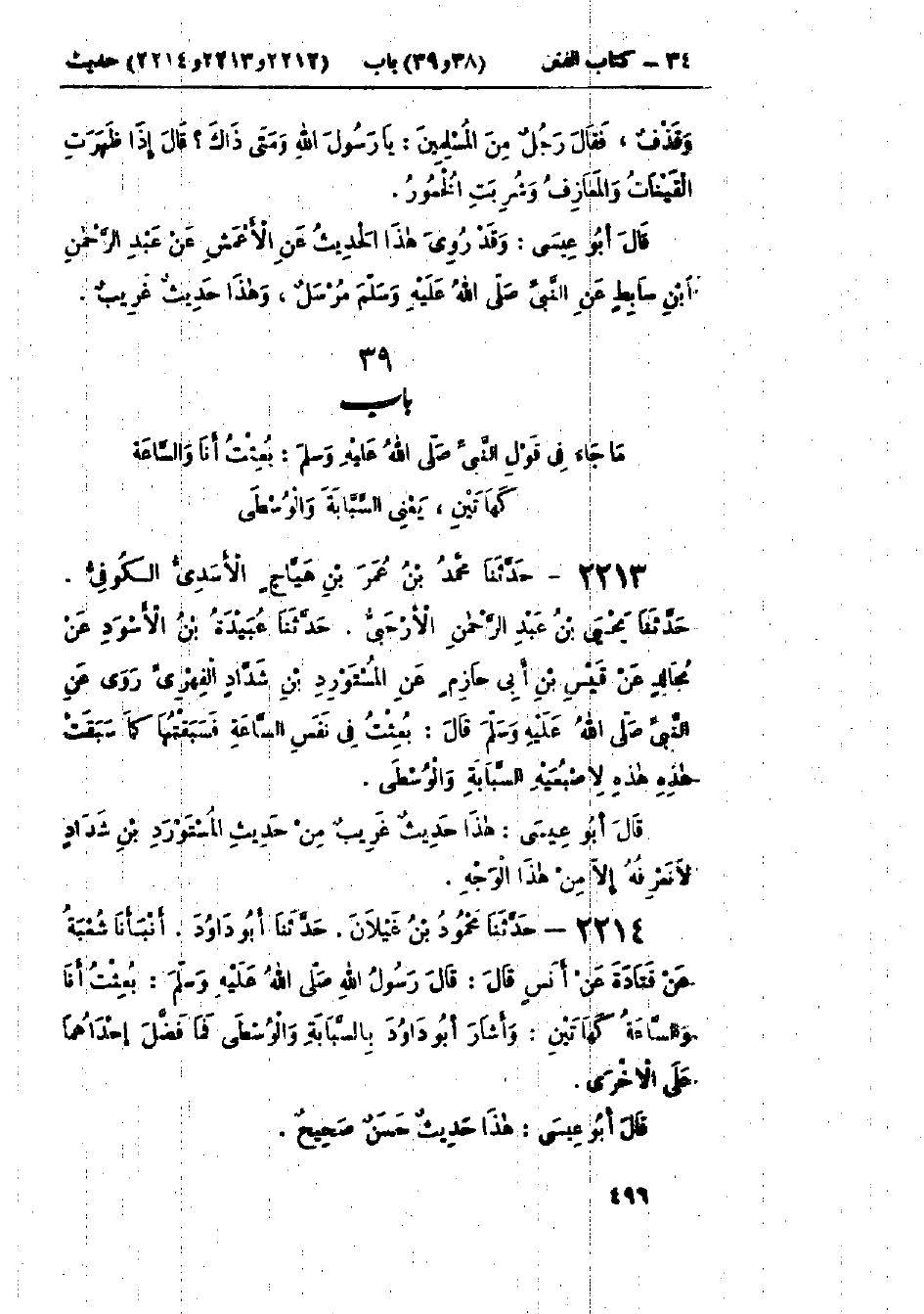 2213 - حَدَّثَنَا مُحَمَّدُ بْنُ عُمَرَ بْنِ هَيَّاجٍ الأَسَدِيُّ الكُوفِيُّ قَالَ: حَدَّثَنَا يَحْيَى بْنُ عَبْدِ الرَّحْمَنِ الأَرْحَبِيُّ قَالَ: حَدَّثَنَا عُبَيْدَةُ بْنُ الأَسْوَدِ، عَنْ مُجَالِدٍ، عَنْ قَيْسِ بْنِ أَبِي حَازِمٍ، عَنْ المُسْتَوْرِدِ بْنِ شَدَّادٍ الفِهْرِيِّ، رَوَى عَنِ النَّبِيِّ صَلَّى اللَّهُ عَلَيْهِ وَسَلَّمَ قَالَ: «§بُعِثْتُ فِي نَفَسِ السَّاعَةِ فَسَبَقْتُهَا كَمَا سَبَقَتْ هَذِهِ هَذِهِ» لِأُصْبُعَيْهِ السَّبَّابَةِ وَالوُسْطَى: هَذَا حَدِيثٌ غَرِيبٌ مِنْ حَدِيثِ المُسْتَوْرِدِ بْنِ شَدَّادٍ لَا نَعْرِفُهُ إِلَّا مِنْ هَذَا الوَجْهِ
