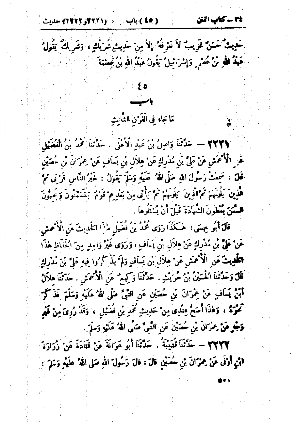 2221 - حَدَّثَنَا وَاصِلُ بْنُ عَبْدِ الأَعْلَى قَالَ: حَدَّثَنَا مُحَمَّدُ بْنُ الفُضَيْلِ، عَنْ الأَعْمَشِ، عَنْ عَلِيِّ بْنِ مُدْرِكٍ، عَنْ هِلَالِ بْنِ يَسَافٍ، عَنْ عِمْرَانَ بْنِ حُصَيْنٍ قَالَ: سَمِعْتُ رَسُولَ اللَّهِ صَلَّى اللَّهُ عَلَيْهِ وَسَلَّمَ يَقُولُ: «§خَيْرُ النَّاسِ قَرْنِي، ثُمَّ الَّذِينَ يَلُونَهُمْ، ثُمَّ الَّذِينَ يَلُونَهُمْ، ثُمَّ يَأْتِي مِنْ بَعْدِهِمْ قَوْمٌ يَتَسَمَّنُونَ وَيُحِبُّونَ السِّمَنَ يُعْطُونَ الشَّهَادَةَ قَبْلَ أَنْ يُسْأَلُوهَا»: هَكَذَا رَوَى مُحَمَّدُ بْنُ فُضَيْلٍ هَذَا الحَدِيثَ، عَنِ الأَعْمَشِ، عَنْ عَلِيِّ بْنِ مُدْرِكٍ، عَنْ هِلَالِ بْنِ يَسَافٍ وَرَوَى غَيْرُ وَاحِدٍ مِنَ الحُفَّاظِ هَذَا الحَدِيثَ، عَنِ الأَعْمَشِ، عَنْ هِلَالِ بْنِ يَسَافٍ وَلَمْ يَذْكُرُوا فِيهِ عَلِيَّ بْنَ مُدْرِكٍ وحَدَّثَنَا الحُسَيْنُ بْنُ حُرَيْثٍ قَالَ: حَدَّثَنَا وَكِيعٌ، عَنْ الأَعْمَشِ قَالَ: حَدَّثَنَا هِلَالُ بْنُ يَسَافٍ، عَنْ عِمْرَانَ بْنِ حُصَيْنٍ، عَنِ النَّبِيِّ صَلَّى اللَّهُ عَلَيْهِ وَسَلَّمَ، فَذَكَرَ نَحْوَهُ وَهَذَا أَصَحُّ عِنْدِي مِنْ حَدِيثِ مُحَمَّدِ بْنِ فُضَيْلٍ وَقَدْ رُوِيَ مِنْ غَيْرِ وَجْهٍ عَنْ عِمْرَانَ بْنِ حُصَيْنِ عَنِ النَّبِيِّ صَلَّى اللَّهُ عَلَيْهِ وَسَلَّمَ