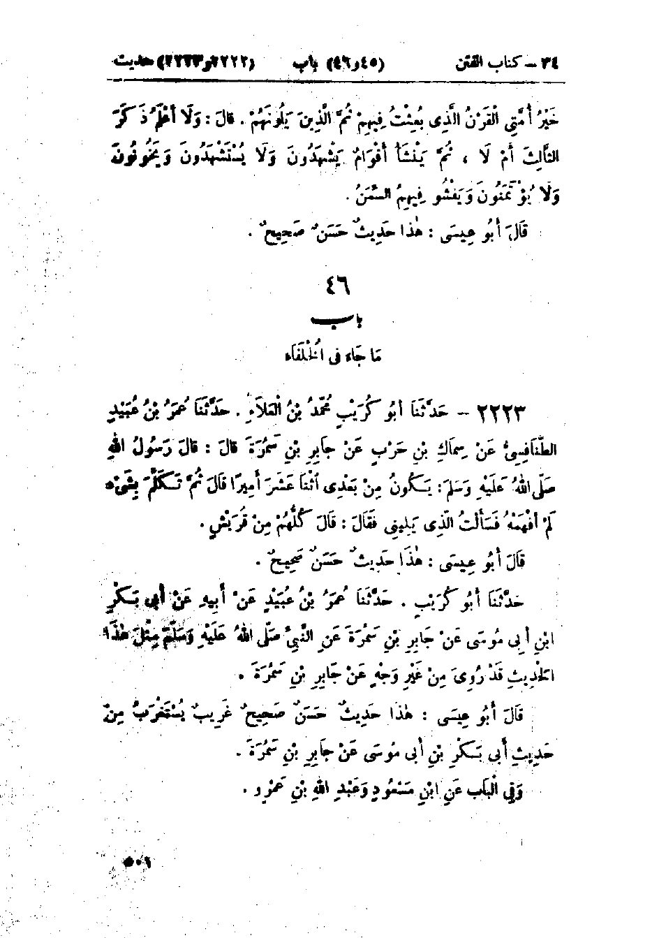 2223 - حَدَّثَنَا أَبُو كُرَيْبٍ مُحَمَّدُ بْنُ العَلَاءِ قَالَ: حَدَّثَنَا عُمَرُ بْنُ عُبَيْدٍ الطَّنَافِسِيُّ، عَنْ سِمَاكِ بْنِ حَرْبٍ، عَنْ جَابِرِ بْنِ سَمُرَةَ قَالَ: قَالَ رَسُولُ اللَّهِ صَلَّى اللَّهُ عَلَيْهِ وَسَلَّمَ: «§يَكُونُ مِنْ بَعْدِي اثْنَا عَشَرَ أَمِيرًا»، قَالَ: ثُمَّ تَكَلَّمَ بِشَيْءٍ لَمْ أَفْهَمْهُ فَسَأَلْتُ الَّذِي يَلِينِي، فَقَالَ: قَالَ: «كُلُّهُمْ مِنْ قُرَيْشٍ»: هَذَا حَدِيثٌ حَسَنٌ صَحِيحٌ حَدَّثَنَا أَبُو كُرَيْبٍ قَالَ: حَدَّثَنَا عُمَرُ بْنُ عُبَيْدٍ، عَنْ أَبِيهِ، عَنْ أَبِي بَكْرِ بْنِ أَبِي مُوسَى، عَنْ جَابِرِ بْنِ سَمُرَةَ، عَنِ النَّبِيِّ صَلَّى اللَّهُ عَلَيْهِ وَسَلَّمَ مِثْلَ هَذَا الحَدِيثِ وَقَدْ رُوِيَ مِنْ غَيْرِ وَجْهٍ عَنْ جَابِرِ بْنِ سَمُرَةَ: هَذَا حَدِيثٌ غَرِيبٌ يُسْتَغْرَبُ مِنْ حَدِيثِ أَبِي بَكْرِ بْنِ أَبِي مُوسَى، عَنْ جَابِرِ بْنِ سَمُرَةَ وَفِي البَاب عَنْ ابْنِ مَسْعُودٍ، وَعَبْدِ اللَّهِ بْنِ عَمْرٍو