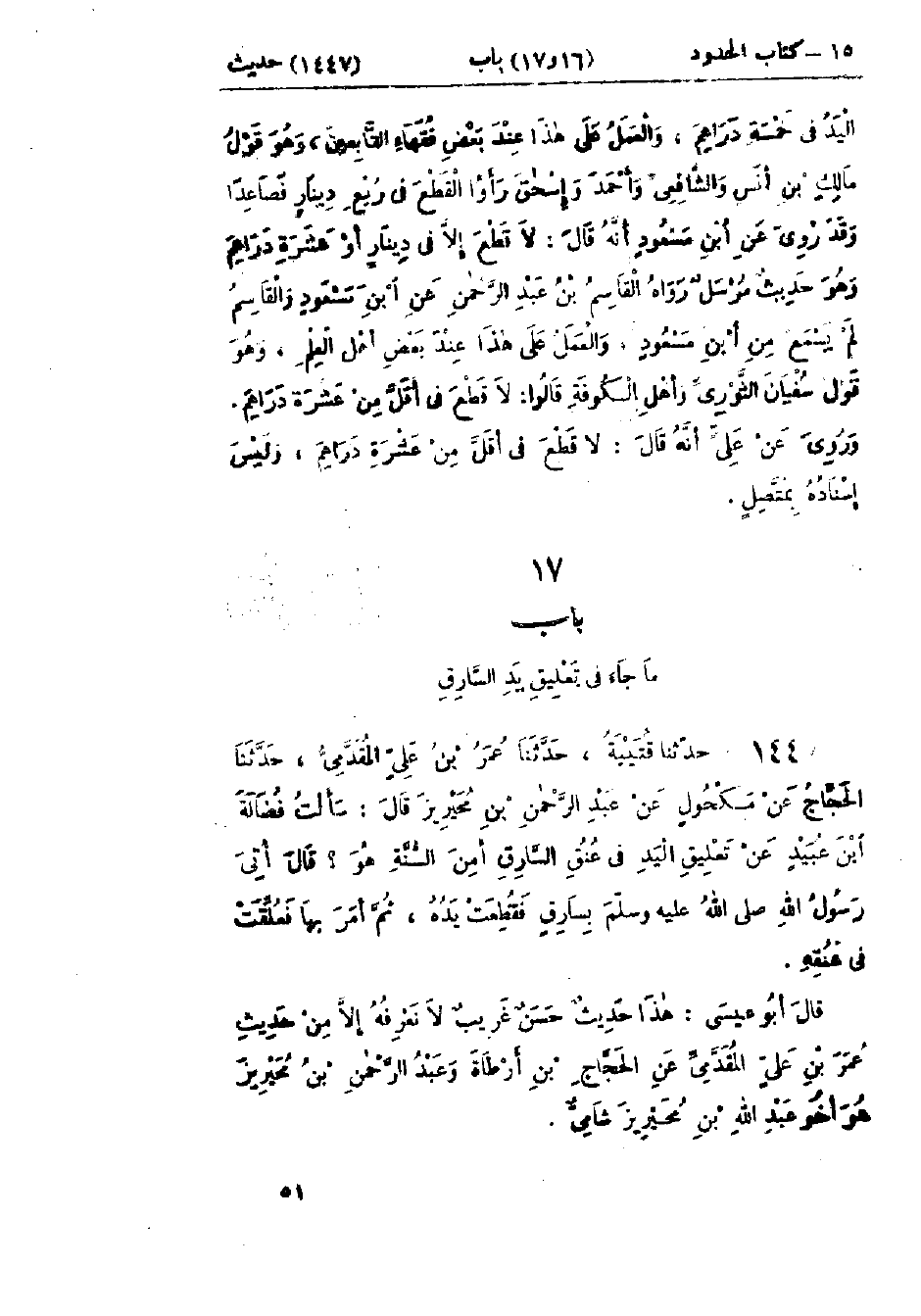 1447 - حَدَّثَنَا قُتَيْبَةُ قَالَ: حَدَّثَنَا عُمَرُ بْنُ عَلِيٍّ المُقَدَّمِيُّ قَالَ: حَدَّثَنَا الحَجَّاجُ، عَنْ مَكْحُولٍ، عَنْ عَبْدِ الرَّحْمَنِ بْنِ مُحَيْرِيزٍ، قَالَ: سَأَلْتُ فَضَالَةَ بْنَ عُبَيْدٍ عَنْ تَعْلِيقِ اليَدِ فِي عُنُقِ السَّارِقِ أَمِنَ السُّنَّةِ هُوَ؟ قَالَ: «§أُتِيَ رَسُولُ اللَّهِ صَلَّى اللَّهُ عَلَيْهِ وَسَلَّمَ بِسَارِقٍ فَقُطِعَتْ يَدُهُ، ثُمَّ أَمَرَ بِهَا، فَعُلِّقَتْ فِي عُنُقِهِ»: هَذَا حَدِيثٌ حَسَنٌ غَرِيبٌ لَا نَعْرِفُهُ إِلَّا مِنْ حَدِيثِ عُمَرَ بْنِ عَلِيٍّ المُقَدَّمِيِّ، عَنِ الحَجَّاجِ بْنِ أَرْطَاةَ وَعَبْدُ الرَّحْمَنِ بْنُ مُحَيْرِيزٍ هُوَ أَخُو عَبْدِ اللَّهِ بْنِ مُحَيْرِيزٍ شَامِيٌّ