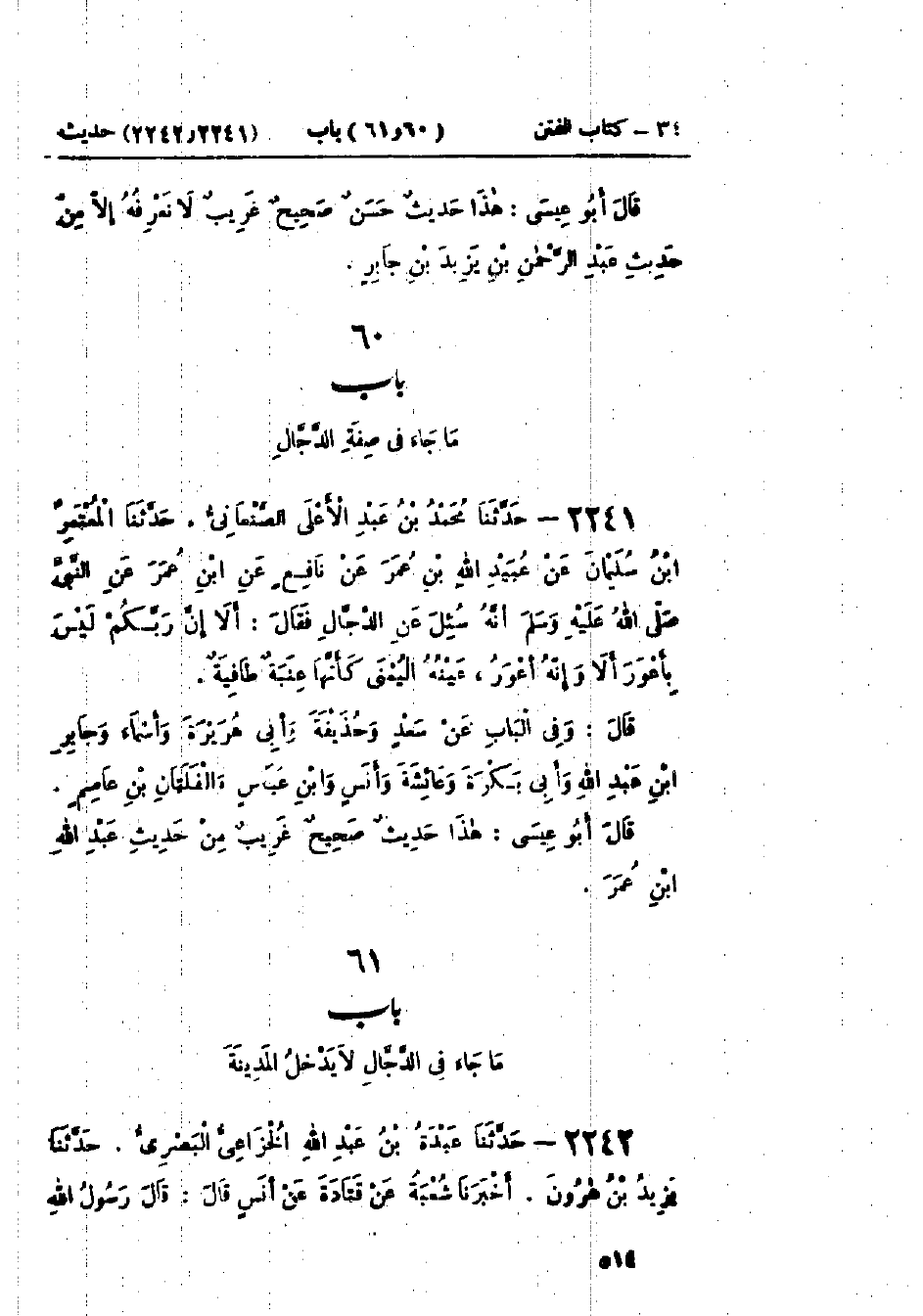 2241 - حَدَّثَنَا مُحَمّدُ بْنُ عَبْدِ الأَعْلَى الصَّنْعَانِيُّ قَالَ: حَدَّثَنَا المُعْتَمِرُ بْنُ سُلَيْمَانَ، عَنْ عُبَيْدِ اللَّهِ بْنِ عُمَرَ، عَنْ نَافِعٍ، عَنْ ابْنِ عُمَرَ، عَنِ النَّبِيِّ صَلَّى اللَّهُ عَلَيْهِ وَسَلَّمَ، أَنَّهُ سُئِلَ عَنِ الدَّجَّالِ، فَقَالَ: «§أَلَا إِنَّ رَبَّكُمْ لَيْسَ بِأَعْوَرَ أَلَا وَإِنَّهُ أَعْوَرُ عَيْنُهُ اليُمْنَى كَأَنَّهَا عِنَبَةٌ طَافِيَةٌ» وَفِي البَاب عَنْ سَعْدٍ، وَحُذَيْفَةَ، وَأَبِي هُرَيْرَةَ، وَأَسْمَاءَ، وَجَابِرِ بْنِ عَبْدِ اللَّهِ، وَأَبِي بَكْرَةَ، وَعَائِشَةَ، وَأَنَسٍ، وَابْنِ عَبَّاسٍ، وَالفَلَتَانِ بْنِ عَاصِمٍ: هَذَا حَدِيثٌ حَسَنٌ صَحِيحٌ غَرِيبٌ مِنْ حَدِيثِ عَبْدِ اللَّهِ بْنِ عُمَرَ