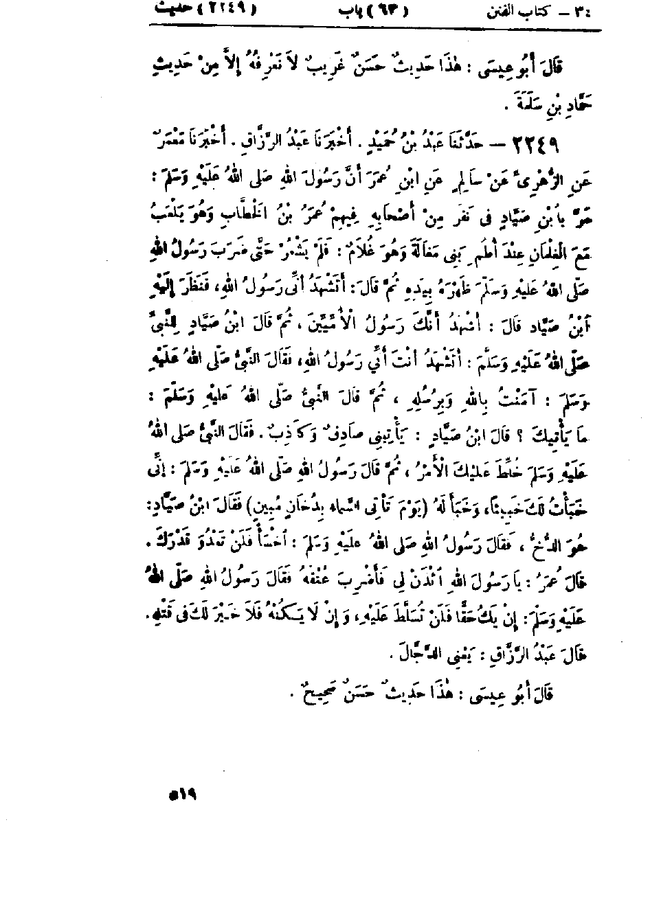 2249 - حَدَّثَنَا عَبْدُ بْنُ حُمَيْدٍ قَالَ: أَخْبَرَنَا عَبْدُ الرَّزَّاقِ قَالَ: أَخْبَرَنَا مَعْمَرٌ، عَنْ الزُّهْرِيِّ، عَنْ سَالِمٍ، عَنْ ابْنِ عُمَرَ، أَنَّ رَسُولَ اللَّهِ صَلَّى اللَّهُ عَلَيْهِ وَسَلَّمَ مَرَّ بِابْنِ صَيَّادٍ فِي نَفَرٍ مِنْ أَصْحَابِهِ فِيهِمْ عُمَرُ بْنُ الخَطَّابِ وَهُوَ يَلْعَبُ مَعَ الغِلْمَانِ عِنْدَ أُطُمِ بَنِي مَغَالَةَ وَهُوَ غُلَامٌ، فَلَمْ يَشْعُرْ حَتَّى ضَرَبَ رَسُولُ اللَّهِ صَلَّى اللَّهُ عَلَيْهِ وَسَلَّمَ ظَهْرَهُ بِيَدِهِ ثُمَّ قَالَ: «§أَتَشْهَدُ أَنِّي رَسُولُ اللَّهِ؟» فَنَظَرَ إِلَيْهِ ابْنُ صَيَّادٍ قَالَ: أَشْهَدُ أَنَّكَ رَسُولُ الأُمِّيِّينَ، ثُمَّ قَالَ ابْنُ صَيَّادٍ لِلنَّبِيِّ صَلَّى اللَّهُ عَلَيْهِ وَسَلَّمَ: أَتَشْهَدُ أَنْتَ أَنِّي رَسُولُ اللَّهِ؟ فَقَالَ النَّبِيُّ صَلَّى اللَّهُ عَلَيْهِ وَسَلَّمَ: «آمَنْتُ بِاللَّهِ وَبِرُسُلِهِ» ثُمَّ قَالَ النَّبِيُّ صَلَّى اللَّهُ عَلَيْهِ وَسَلَّمَ: «مَا يَأْتِيكَ؟» قَالَ ابْنُ صَيَّادٍ: يَأْتِينِي صَادِقٌ وَكَاذِبٌ، فَقَالَ النَّبِيُّ صَلَّى اللَّهُ عَلَيْهِ وَسَلَّمَ: «خُلِّطَ عَلَيْكَ الأَمْرُ»، ثُمَّ قَالَ رَسُولُ اللَّهِ صَلَّى اللَّهُ عَلَيْهِ وَسَلَّمَ: «إِنِّي خَبَأْتُ لَكَ خَبِيئًا» وَخَبَأَ لَهُ {يَوْمَ تَأْتِي السَّمَاءُ بِدُخَانٍ مُبِينٍ} [الدخان: 10] فَقَالَ ابْنُ صَيَّادٍ: هُوَ الدُّخُّ، فَقَالَ رَسُولُ اللَّهِ صَلَّى اللَّهُ عَلَيْهِ وَسَلَّمَ: «اخْسَأْ فَلَنْ تَعْدُوَ قَدْرَكَ» قَالَ عُمَرُ: يَا رَسُولَ اللَّهِ، ائْذَنْ لِي فَأَضْرِبَ عُنُقَهُ، فَقَالَ رَسُولُ اللَّهِ صَلَّى اللَّهُ عَلَيْهِ وَسَلَّمَ: «إِنْ يَكُ حَقًّا فَلَنْ تُسَلَّطَ عَلَيْهِ، وَإِنْ لَا يَكُنْهُ فَلَا خَيْرَ لَكَ فِي قَتْلِهِ» قَالَ عَبْدُ الرَّزَّاقِ: يَعْنِي الدَّجَّالَ،: هَذَا حَدِيثٌ صَحِيحٌ