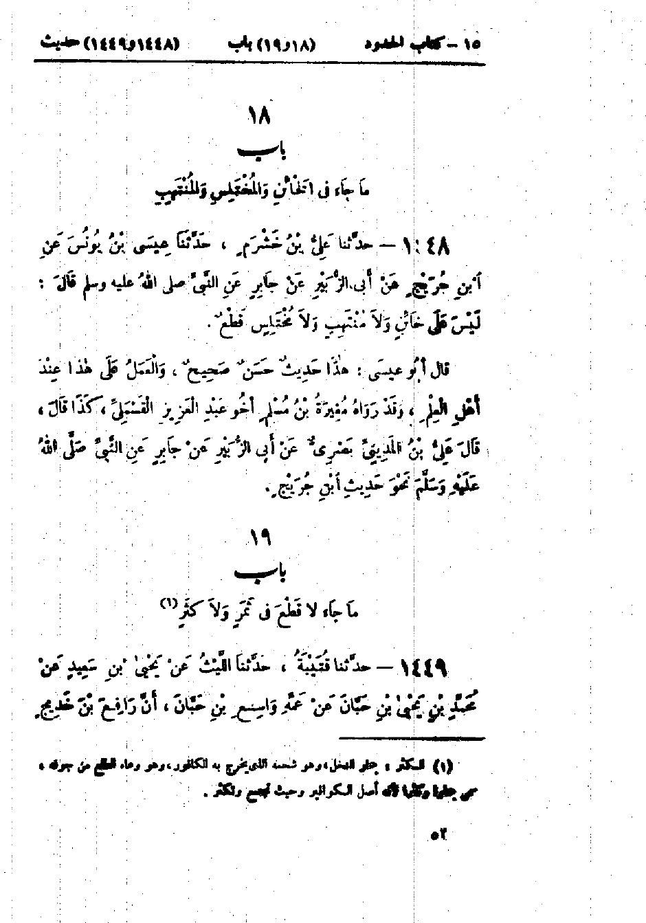 1448 - حَدَّثَنَا عَلِيُّ بْنُ خَشْرَمٍ قَالَ: حَدَّثَنَا عِيسَى بْنُ يُونُسَ، عَنْ ابْنِ جُرَيْجٍ، عَنْ أَبِي الزُّبَيْرِ، عَنْ جَابِرٍ، عَنِ النَّبِيِّ صَلَّى اللَّهُ عَلَيْهِ وَسَلَّمَ قَالَ: «§لَيْسَ عَلَى خَائِنٍ، وَلَا مُنْتَهِبٍ، وَلَا مُخْتَلِسٍ قَطْعٌ»: هَذَا حَدِيثٌ حَسَنٌ صَحِيحٌ، وَالعَمَلُ عَلَى هَذَا عِنْدَ أَهْلِ العِلْمِ وَقَدْ رَوَاهُ مُغِيرَةُ بْنُ مُسْلِمٍ، عَنْ أَبِي الزُّبَيْرِ، عَنْ جَابِرٍ، عَنِ النَّبِيِّ صَلَّى اللَّهُ عَلَيْهِ وَسَلَّمَ نَحْوَ حَدِيثِ ابْنِ جُرَيْجٍ. الْمُغِيرَةُ بْنُ مُسْلِمٍ هُوَ بَصْرِيٌّ أَخُو عَبْدِ الْعَزِيزِ الْقَسْمَلِيِّ كَذَا قَالَ عَلِيُّ بْنُ المَدِينِيِّ