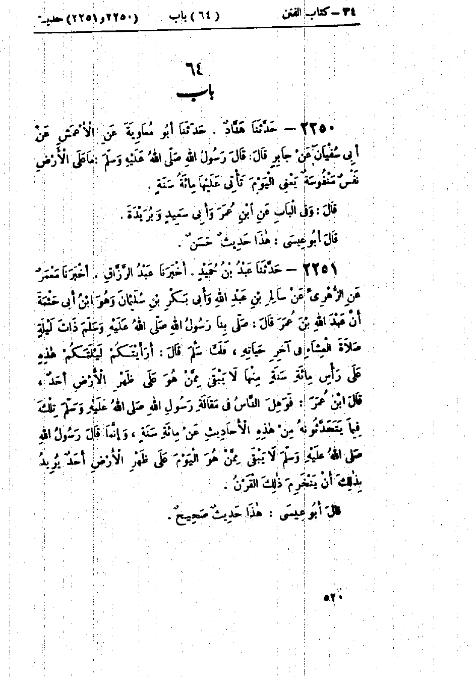 2251 - حَدَّثَنَا عَبْدُ بْنُ حُمَيْدٍ قَالَ: أَخْبَرَنَا عَبْدُ الرَّزَّاقِ قَالَ: أَخْبَرَنَا مَعْمَرٌ، عَنْ الزُّهْرِيِّ، عَنْ سَالِمِ بْنِ عَبْدِ اللَّهِ، وَأَبِي بَكْرِ بْنِ سُلَيْمَانَ وَهُوَ ابْنُ أَبِي حَثْمَةَ، أَنَّ عَبْدَ اللَّهِ بْنَ عُمَرَ قَالَ: صَلَّى بِنَا رَسُولُ اللَّهِ صَلَّى اللَّهُ عَلَيْهِ وَسَلَّمَ ذَاتَ لَيْلَةٍ صَلَاةَ العِشَاءِ فِي آخِرِ حَيَاتِهِ، فَلَمَّا سَلَّمَ قَالَ: «§أَرَأَيْتَكُمْ لَيْلَتَكُمْ هَذِهِ عَلَى رَأْسِ مِائَةِ سَنَةٍ مِنْهَا لَا يَبْقَى مِمَّنْ هُوَ عَلَى ظَهْرِ الأَرْضِ أَحَدٌ» قَالَ ابْنُ عُمَرَ: فَوَهِلَ النَّاسُ فِي مَقَالَةِ رَسُولِ اللَّهِ صَلَّى اللَّهُ عَلَيْهِ وَسَلَّمَ تِلْكَ فِيمَا يَتَحَدَّثُونَهُ مِنْ هَذِهِ الأَحَادِيثِ عَنْ مِائَةِ سَنَةٍ، وَإِنَّمَا قَالَ رَسُولُ اللَّهِ صَلَّى اللَّهُ عَلَيْهِ وَسَلَّمَ: «لَا يَبْقَى مِمَّنْ هُوَ اليَوْمَ عَلَى ظَهْرِ الأَرْضِ أَحَدٌ»، يُرِيدُ بِذَلِكَ أَنْ يَنْخَرِمَ ذَلِكَ القَرْنُ: هَذَا حَدِيثٌ حَسَنٌ صَحِيحٌ