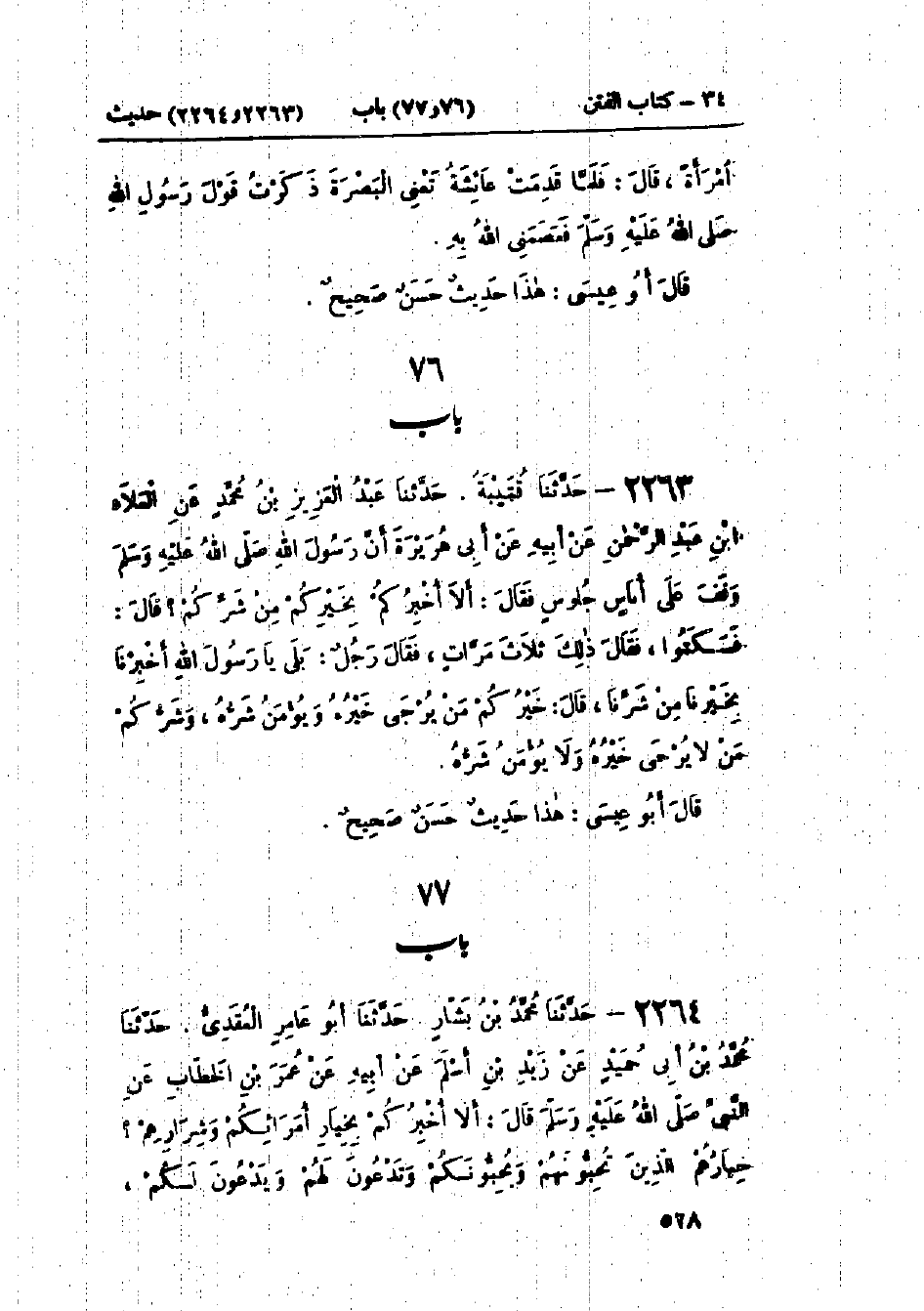 2263 - حَدَّثَنَا قُتَيْبَةُ قَالَ: حَدَّثَنَا عَبْدُ العَزِيزِ بْنُ مُحَمَّدٍ، عَنْ العَلَاءِ بْنِ عَبْدِ الرَّحْمَنِ، عَنْ أَبِيهِ، عَنْ أَبِي هُرَيْرَةَ، أَنَّ رَسُولَ اللَّهِ صَلَّى اللَّهُ عَلَيْهِ وَسَلَّمَ وَقَفَ عَلَى نَاسٍ جُلُوسٍ، فَقَالَ: «أَلَا أُخْبِرُكُمْ بِخَيْرِكُمْ مِنْ شَرِّكُمْ؟» قَالَ: فَسَكَتُوا، فَقَالَ ذَلِكَ ثَلَاثَ مَرَّاتٍ، فَقَالَ رَجُلٌ: بَلَى يَا رَسُولَ اللَّهِ، أَخْبِرْنَا بِخَيْرِنَا مِنْ شَرِّنَا، قَالَ: «§خَيْرُكُمْ مَنْ يُرْجَى خَيْرُهُ وَيُؤْمَنُ شَرُّهُ، وَشَرُّكُمْ مَنْ لَا يُرْجَى خَيْرُهُ وَلَا يُؤْمَنُ شَرُّهُ»: هَذَا حَدِيثٌ حَسَنٌ صَحِيحٌ